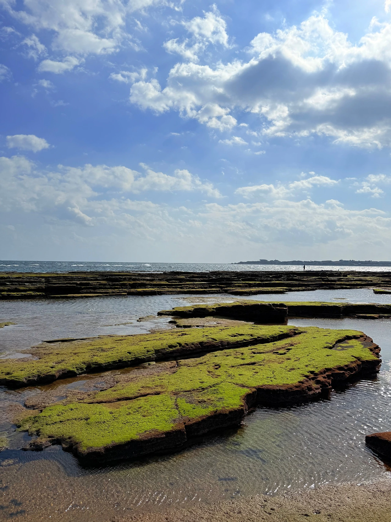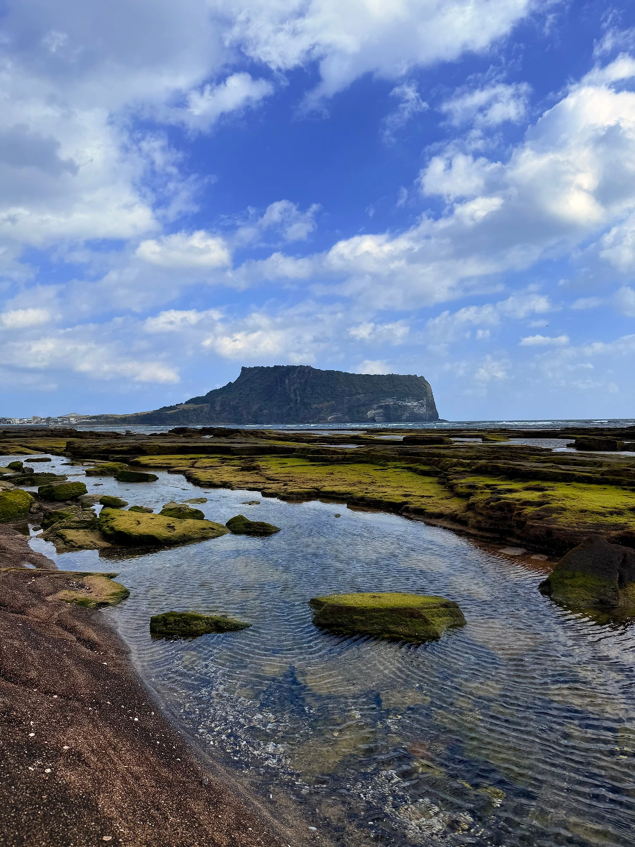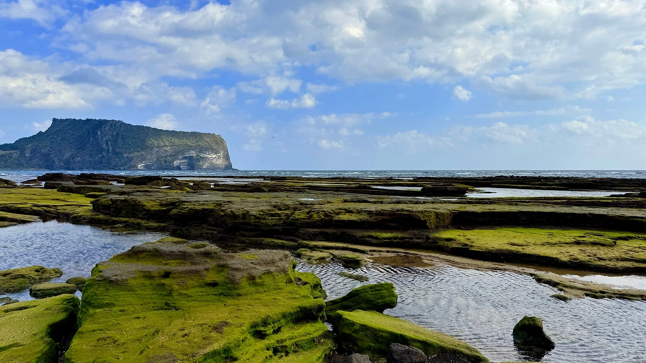 역시나 찾아온 내 앞에 펼쳐진 광경은 여지없이 자연의 찬란함을 선사해 주었다. 모든 구성들이 각자의 색채를 가진 채 조화롭게 펼쳐져 있었고, 그 어느 것도 예외적인 모습을 보이지 않았다. 특히 멀리 감치 보이는 성산일출봉은 자칫 밋밋할 수 있는 하늘의 공백을 채워줬고, 초록빛으로 가득한 바위들도 땅의 곳곳을 메워줬다. 동시에 바위틈으로 잔잔히 흘러가는 바닷물은 경이로움에 들떴던 마음을 한결 차분하게 만들어 줬다. 오늘의 사색을 누려보려는 내게 세상이 마련해 준 또 하나의 선물이구나 싶었다.