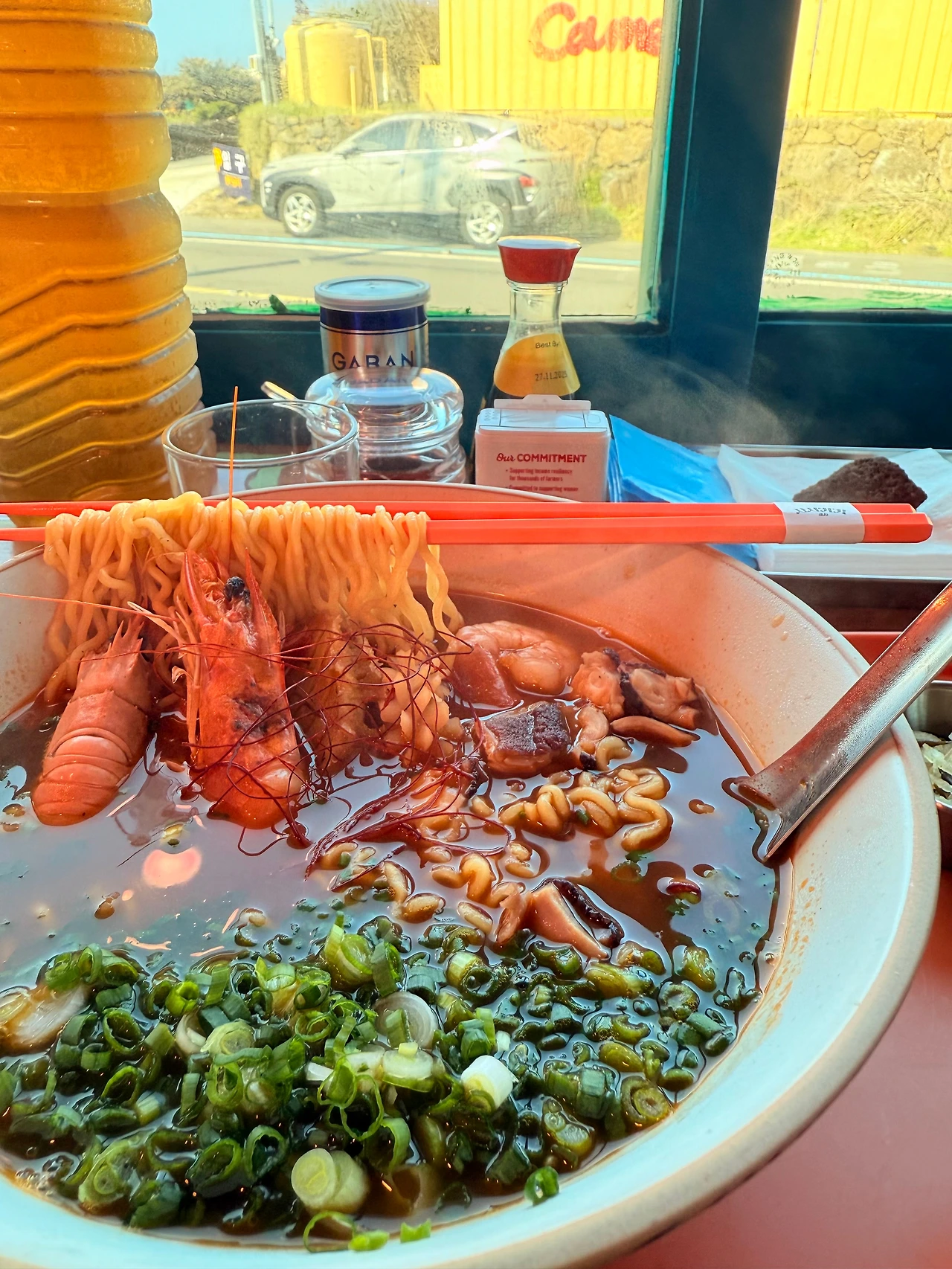 그런 생각이 드는 마침 주문했던 메뉴인 '해물라면'이 나왔다. 역시 이 강렬한 라면냄새가 코에 들어와 바로 먹고 싶었지만, 추억은 남겨야겠다 싶어 한 장의 사진은 남겨봤다. 그리고 식사를 시작했는데 아까의 느낌대로 국물 한 수저가 가장 맛있었고, 중간마다 마시는 콜라 한 캔은 조금이나마 있는 느끼함을 싹 비워줬다. 또한 그 맛을 누리면서 바라보는 바깥 경치는 한마디로 호강이라 할 수 있었다. 그렇게 호강스러운 식사와 경치 구경은 사색을 곁들인 이 여정에서 만족스러운 휴식 시간이 되어줬다.