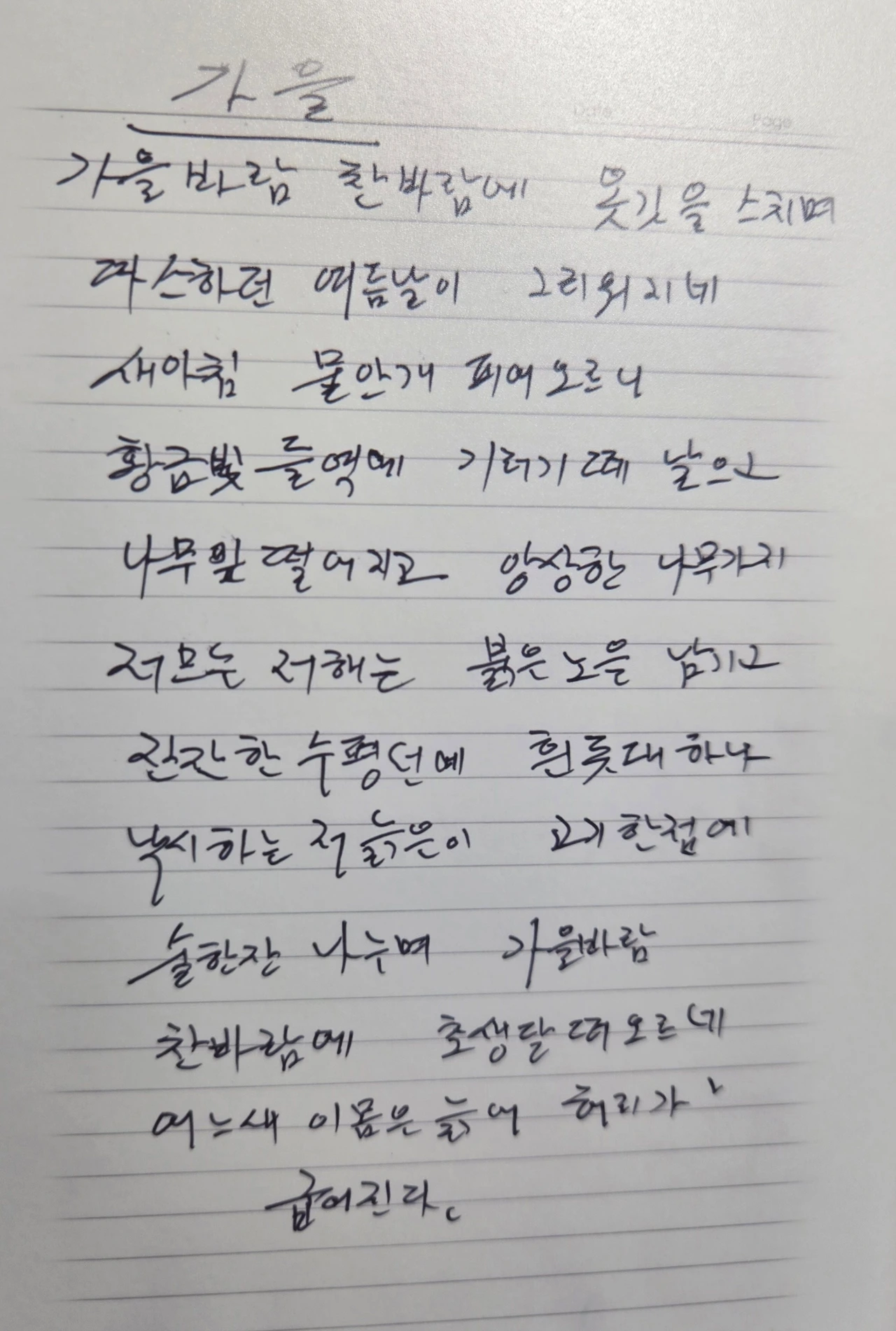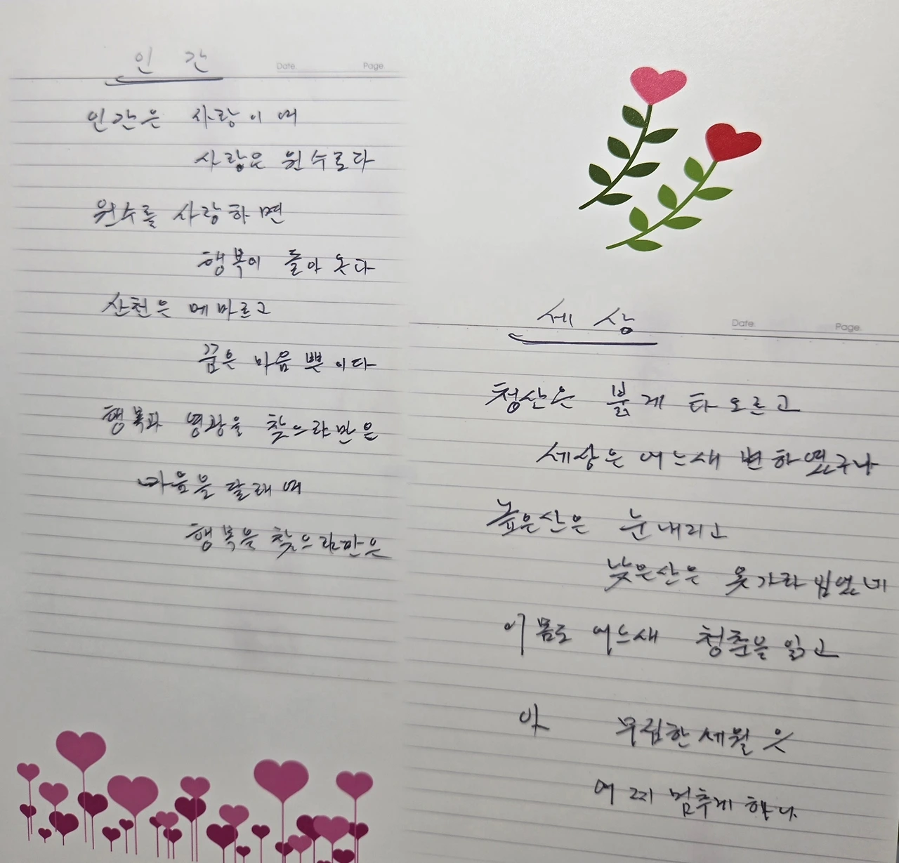 생전 새벽마다 라디오를 들으시고 좋은 구절은 종이에 끄적이며 적으시기도 하고 나름 시 같은 것도 적어 놓으셨던 아버진 어느 날 할아버지를 뵈러 간 손녀(나의 큰딸)에게 적어놓으신 노트를 보여 주셨다.