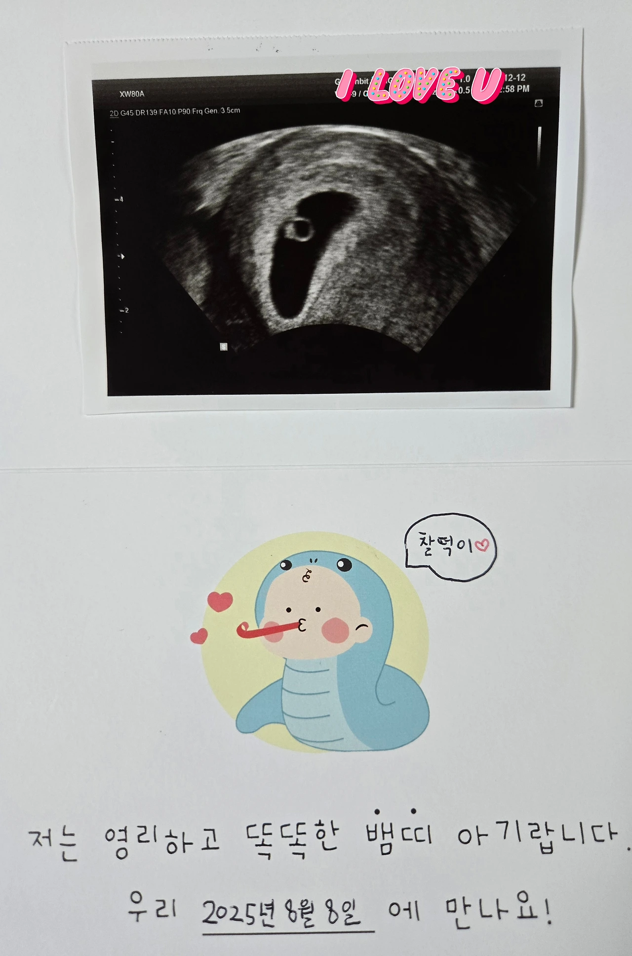 카드에는 초음파 사진과 함께 '찰떡이' '저는 영리하고 똑똑한 뱀띠 아기랍니다. 우리 2025년 8월 8일에 만나요!'라고 쓰여 있었습니다.