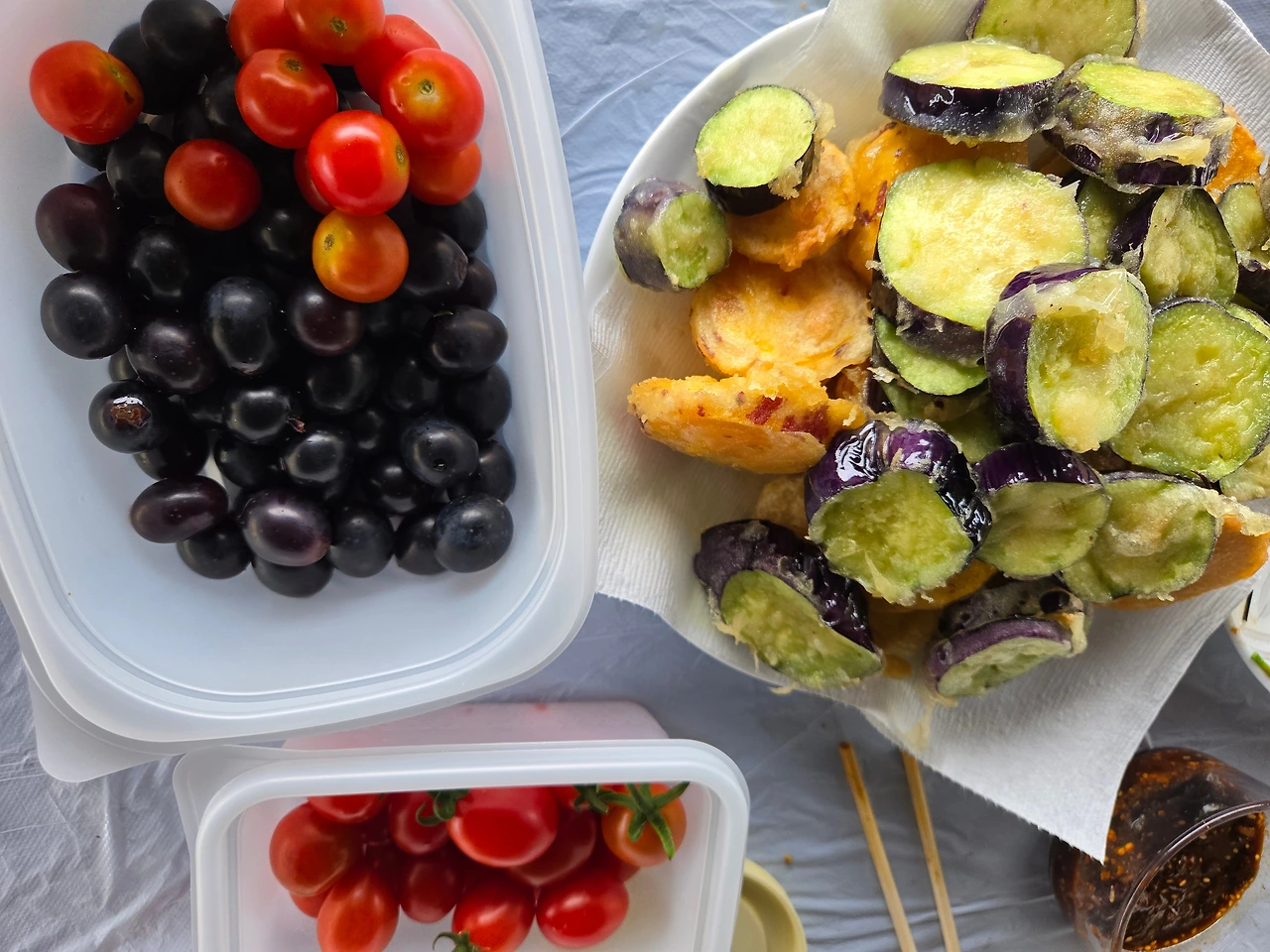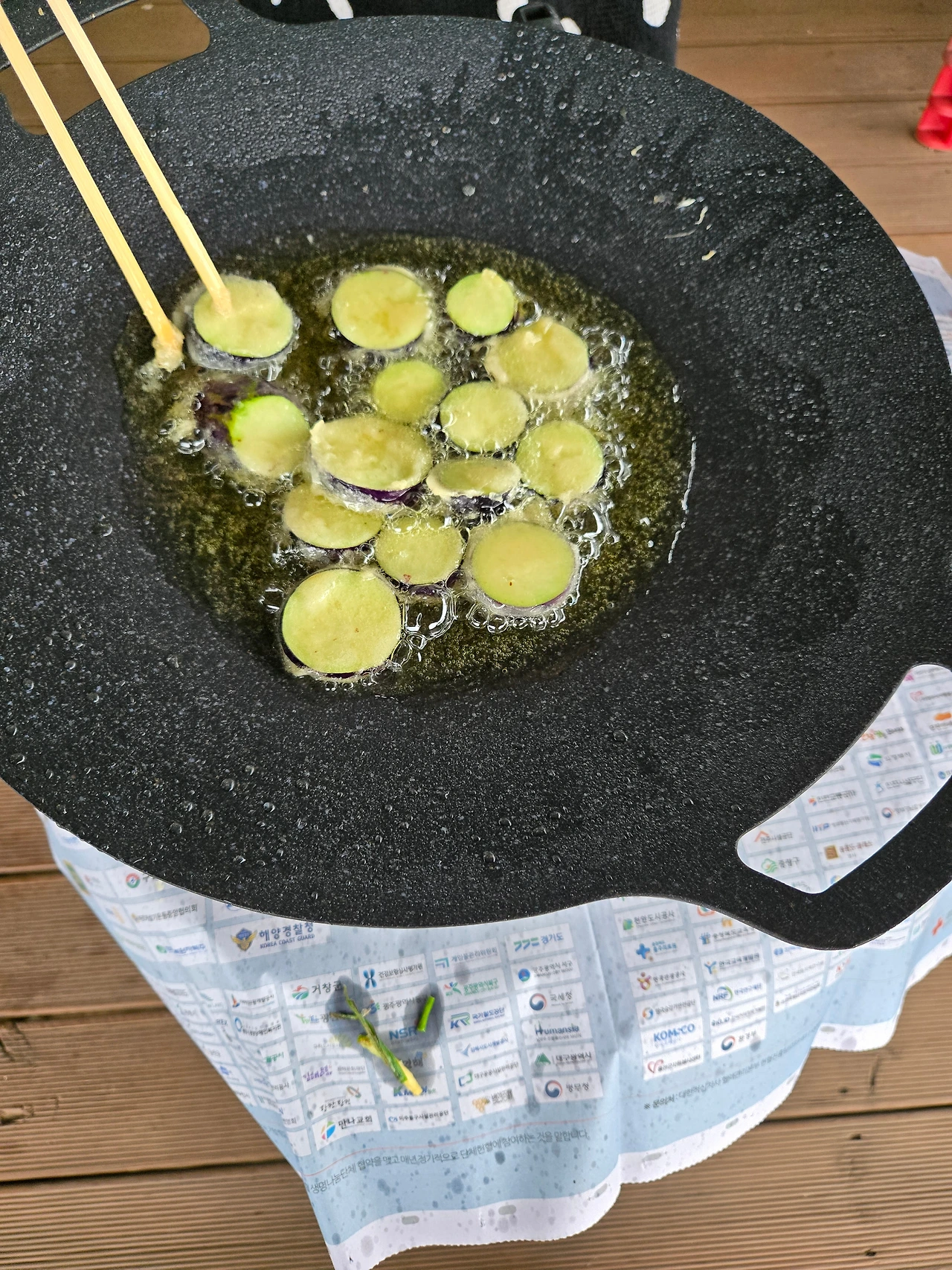 부침개로 시작해서 고구마튀김까지 먹고 3호 집 텃밭에 달려있던 가지를 따다가 씻어, 바로 가지튀김을 합니다. 텃밭에서 바로 수확한 재료들로 뚝딱뚝딱 요리가 나옵니다. 갑자기 열린 촌집의 오마카세식당이 되었습니다.
