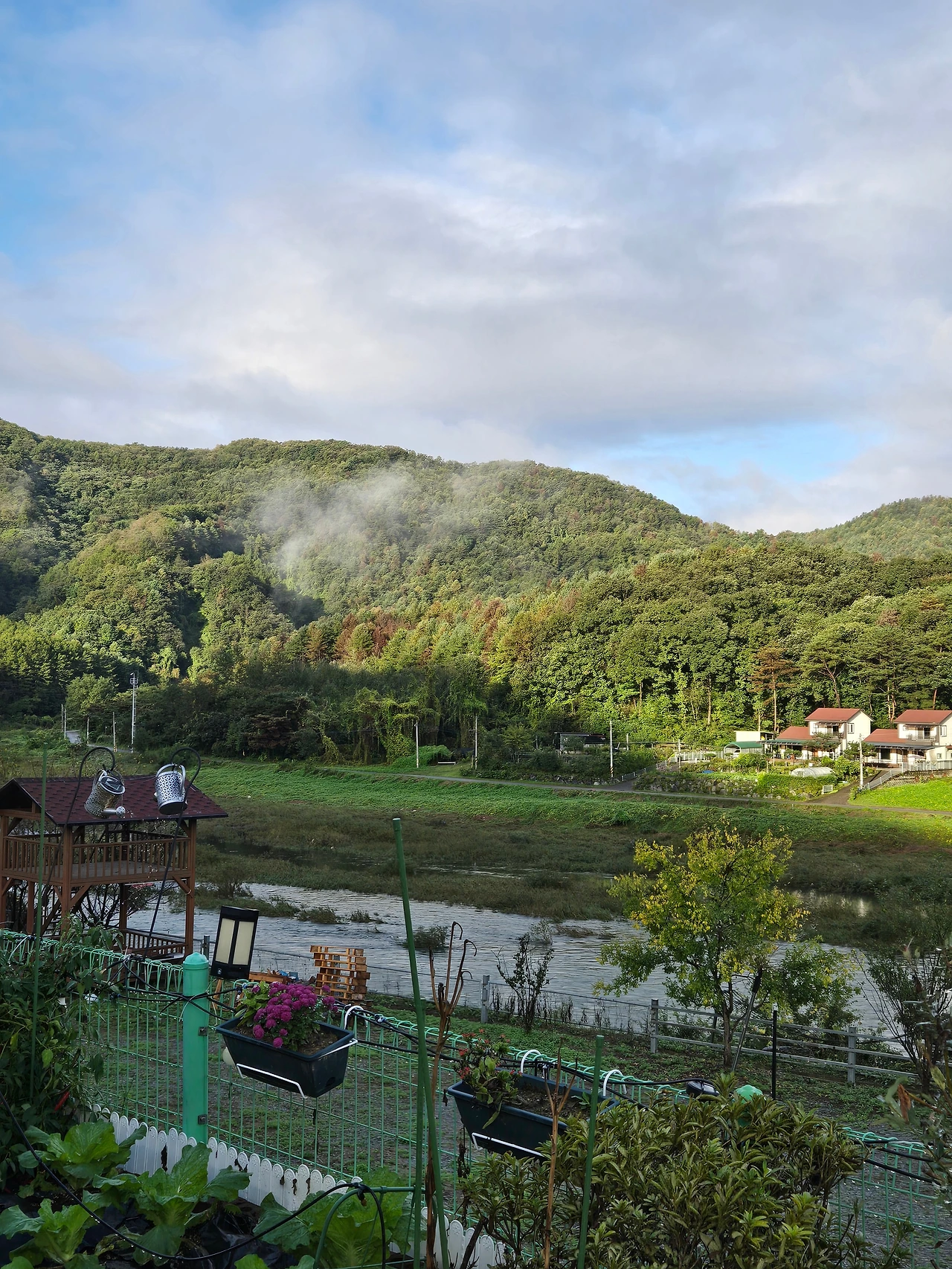 긴 연휴, 비 내리는 촌집 데크 위 지붕으로 떨어지는 정감 있는 빗소리를 들으며 차분하게 온전한 쉼으로 몸과 마음이 충전되었습니다.