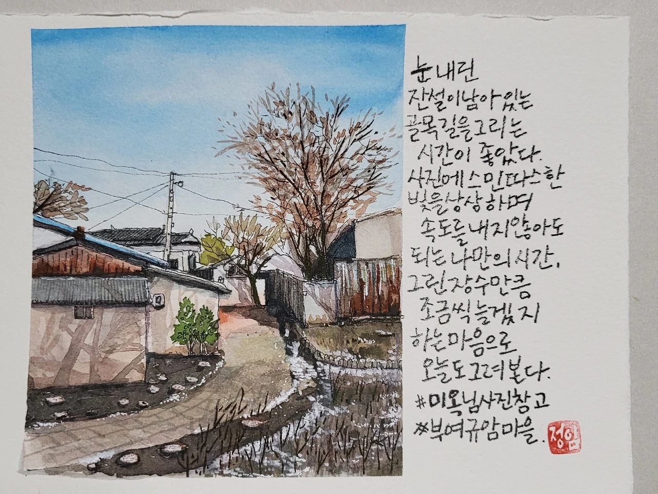 눈 내린 잔설이 남아 있는 골목길을 그리는게 즐겁다.