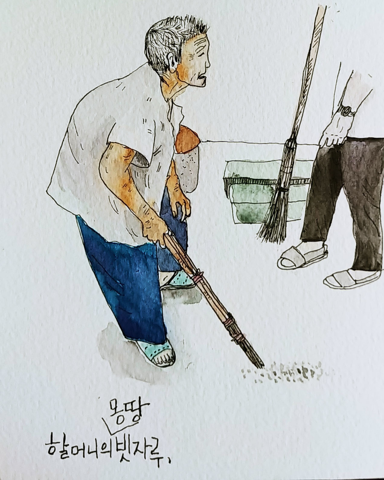 두 달에 한 번씩 노인복지센터를 통해 어르신 머리손질을 해드리고 있다늘 반겨주시고 "복 받으라"라고 하시는 그 말씀에 많은 뜻이 담겨 있음을 알고 있다. 그래서 더 보람을 느끼고 하는 건지도 모른다. 어느 날, 매달 만나는 어르신은 짧은 머리임에도 바짝 잘라달라고 하신다. 머리 손질 후 쓸어야 하는데 "내가 할게"하시며 꺼낸 할머니의 몽땅 빗자루는 빗자루로써의 사명을 다한 듯한데 쓱쓱~익숙한 듯 잘도 쓸으신다. 그 모습이 인상적이라 얼른 사진 한 장 담고 와서 그려보았다. 정말 몽당연필 같다. 세월만큼, 할머니의 굽은 허리만큼 빗자루는 닳고 달아 잘 쓸리지도 않을 것 같은데 할머니 손에는 익숙하다. 할머니의 빗자루는 세월만큼 잘 익어가며 아직도 진행 중이다.