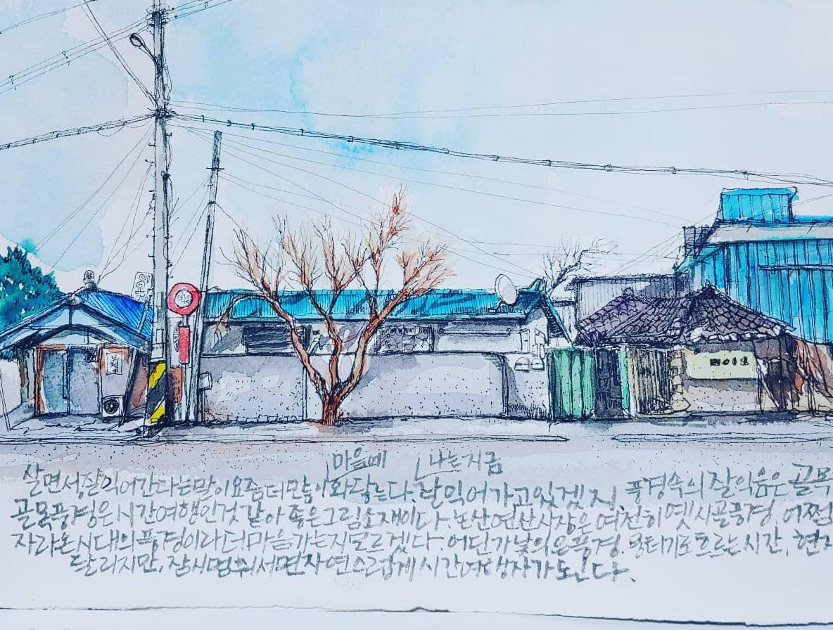 살면서 잘 익어간다는 말이 요즘 더 많이 마음에 와닿는다. 나는 지금, 잘 익어가고 있겠지, 풍경 속의 잘 익음은 골목이다. 골목길은 시간여행이자 좋은 그림 소재이다. 논산 연산시작은 여전히 옛 시골 풍경이다. 어릴 적 골목 풍경이라 그런가 더 마음이 간다. 어딘가 낯익은 거리, 소소한 추억 떠올리며 뭉터기로 흐르는 시간을 소환할 수 있다. 걷다 잠시 멈추면 자연스럽게 시간 여행자가 되는 골목길이다.ⓒ초롱둘 여행드로잉