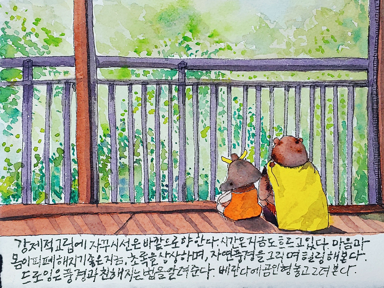 코로나 19 팬데믹으로 바깥 외출이 두려워 강제적 고립이 되었다. 자꾸만 시선은 바깥으로 흐르고 시간은 지금도 흐르고 있다. 마음과 몸이 피폐해지기 좋은 지금, 자연풍경을 그리며 힐링해본다. 드로잉은 풍경과 친해지는 법을 알려준다. @초롱둘