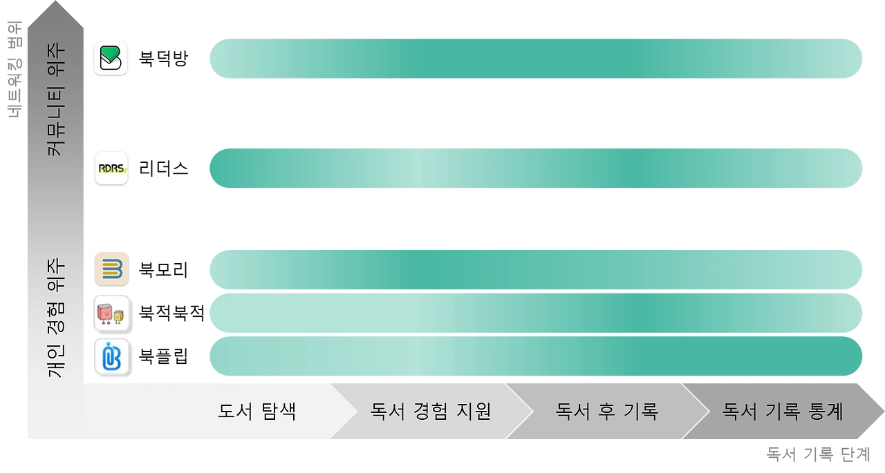2. 독서를 통한 네트워킹 범위 설정에 따라 개인의 독서 경험에 집중하는 서비스, 타인의 독서 기록을 팔로우 할 수 있는 서비스, 독서 커뮤니티 기능을 제공하는 서비스로 나눌 수 있었습니다.
