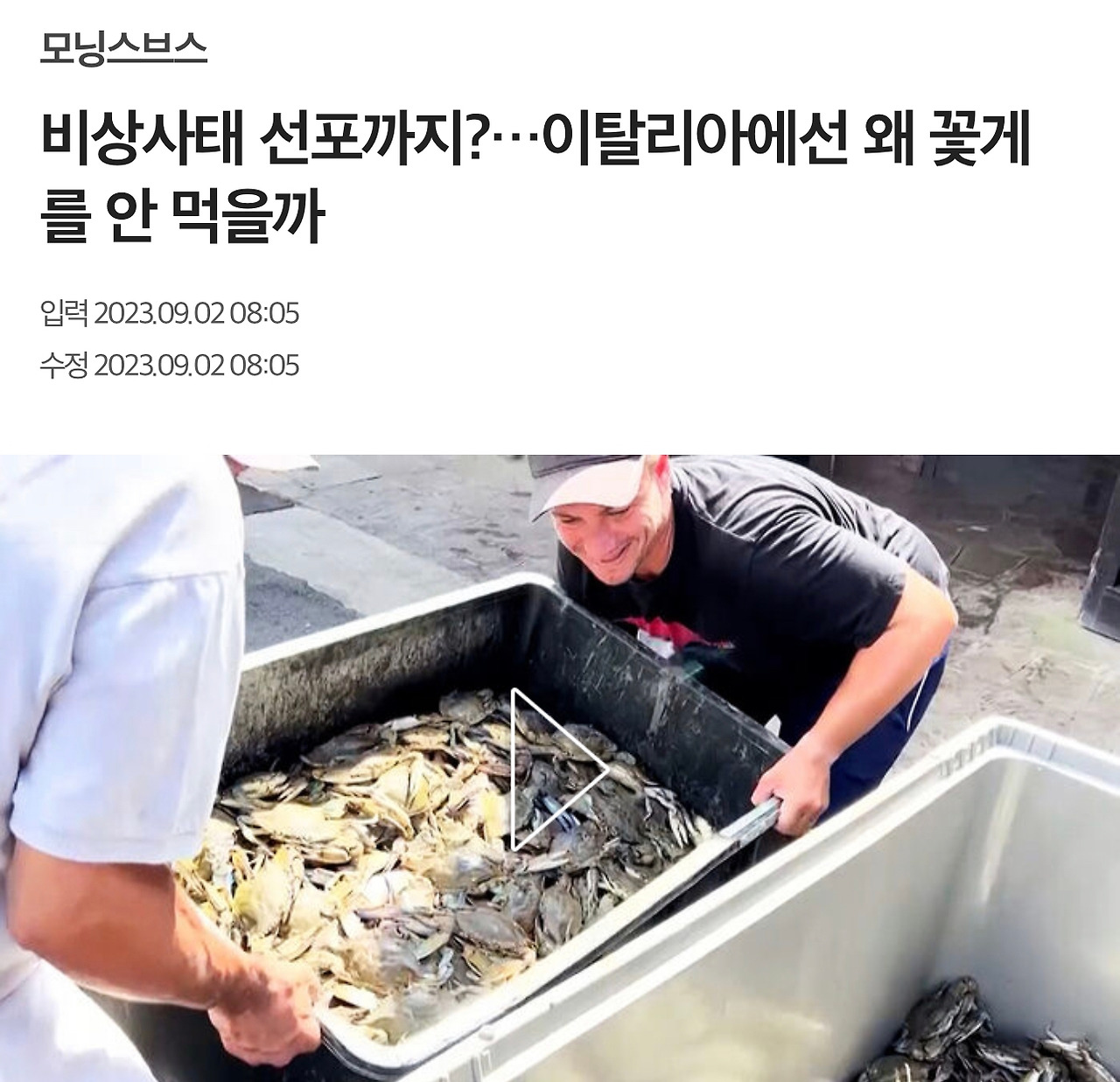 꽂게 요리를 좋아하는가? 작가는 꽃게를 그렇게 좋아하는 편은 아니지만 라면에 넣어 먹으면 그 만한 음식도 없다. 작가 주변에도 간장게장 등 꽃게를 좋아하는 사람들이 많다. 하지만 우리가 이렇게 좋아하는 꽃게 때문에 비상이 걸린 나라가 하나 있으니, 바로 이탈리아다. 이탈리아는 최근 정부 비상사태를 선언하고 푸른 꽃게 퇴치를 위해 290만 유로, 한국 돈 약 42억의 예산을 배정하기까지 했다.