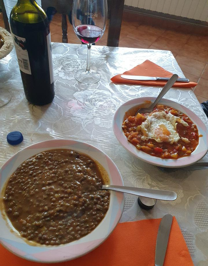 앞으로 걸었다 뒤로 걸었다를 반복하다 보니, 드디어 저 멀리 성당의 종탑이 어렴풋이 보이기 시작합니다. 칼사디아 데 라 쿠레사(Calzadilla de la Cueza)마을로 넓은 평원의 오아시스입니다. 모든 순례자들이 가뿐 숨을 몰아 쉬며 첫 번째 카페 안마당에 장사진을 치고 있습니다. 우리는 또 그들을 피해 옆길로 돌아가니 조그마한 카페가 있어 들어갑니다. 바로 어제 오픈했다는 젊은 부부가 의욕을 가지고 새 사업을 시작하는 카페에서 메뉴 델 디아를 주문합니다. 스페인 현지식처럼 전식-본식-후식으로 나오는 요리는 아주 맛있습니다. 알베르게도 겸하고 있으니 묵고 갔으면 하는 눈치를 주었으나 다음을 기약하고 또 걷습니다.
