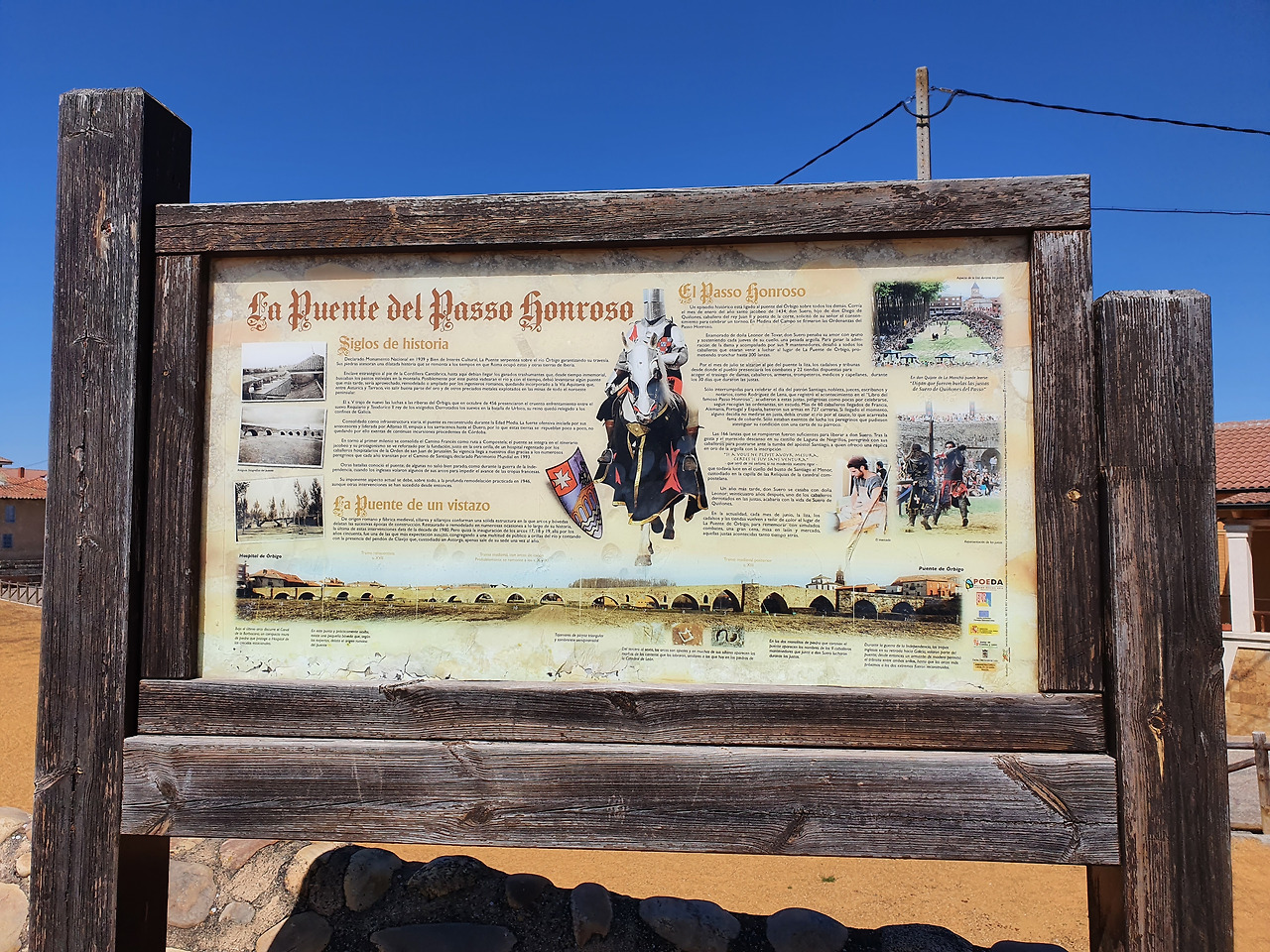 오스삐딸 데 오르비고(Hospital de Orbigo) 마을에는 오르비고 강을 가로지르는 멋진 중세 다리가 있습니다. 스페인에서 가장 길고 오래된 다리라고 합니다. 세르반테스의 <돈키호테>에 모티브를 준 ’돈 수에로 기사의 이야기‘로 유명한 이 도시는 우아했고, 관광객의 모습이 많이 보입니다. 식당 이층 테라스에서 예닐곱 명이 식사를 하는데 ‘꼬레아노’라는 단어가 여러 번 들려 올려다 보며 손을 흔드니 뒤쪽의 몇몇이 호응해 줍니다. 도대체 이곳에서 한국인의 인기는 시들지 않습니다. 마을 소개 현판의 사진을 보니 이곳에서 매년 옛 중세 기사들의 결투를 재현하는 축제가 열리나 봅니다. 몸도 힘들고 지친 터에 하룻밤 묵어갈까 하다 다시 기운을 내어 길을 재촉합니다.