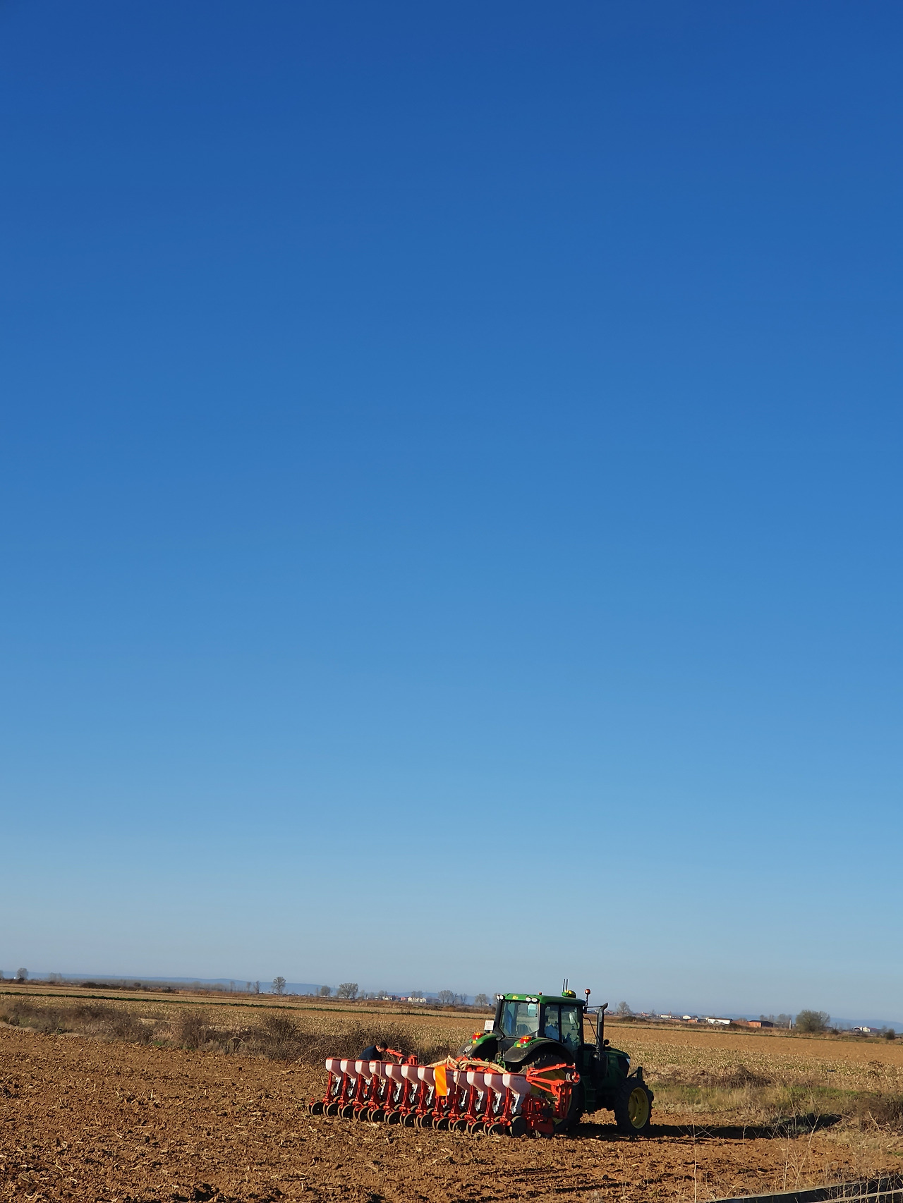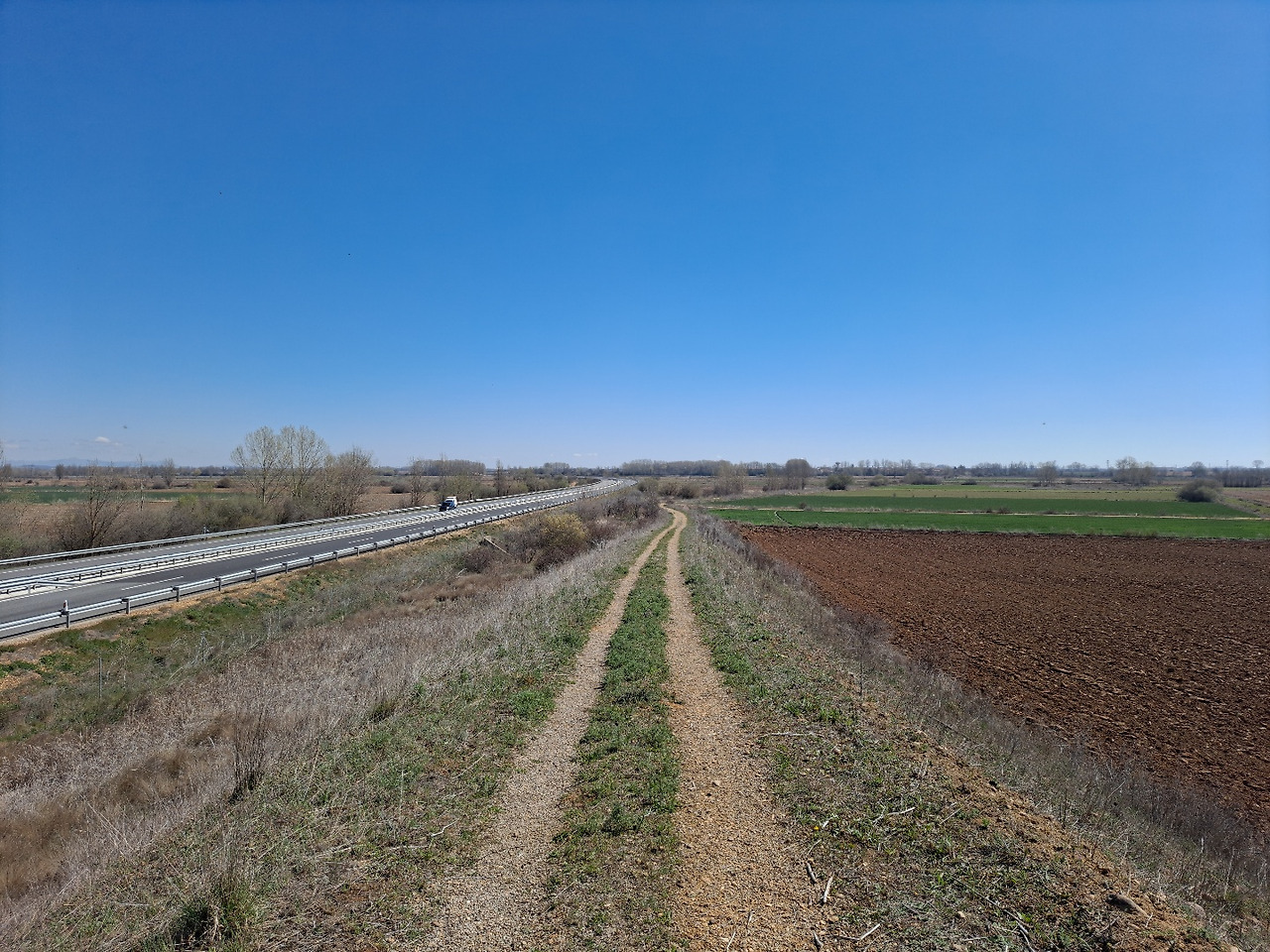 금방 빠져나올 것 같았는데, 생각보다 제법 큰 마을입니다. 도로를 건너니 바로 광활한 밭이 나옵니다. 씨를 뿌리기 위해 갈아엎은 밭, 수확을 끝내고 남아 있는 옥수수 밑동들, 유채꽃 같은 노란색으로 뒤덮인 밭, 거기에 간혹 초록의 밀밭이 보입니다. 피레네산맥을 넘어서 팔렌시아 지방의 메세타 평원을 지나면서 보지 못한 풍경입니다. 순례자가 걸어가는 길에도 자주 트랙터 같은 농기구가 지나갑니다. 스페인은 워낙 땅이 넓어 손으로 경작하는 것은 상상할 수도 없지요. 그래서인지 농업에 필요한 농기계가 엄청 세분화되고 발달된 모습을 봅니다. 밭을 가는 기계나 씨를 뿌리는 기계가 거의 트랙터같이 크고 단단하게 생겼습니다.