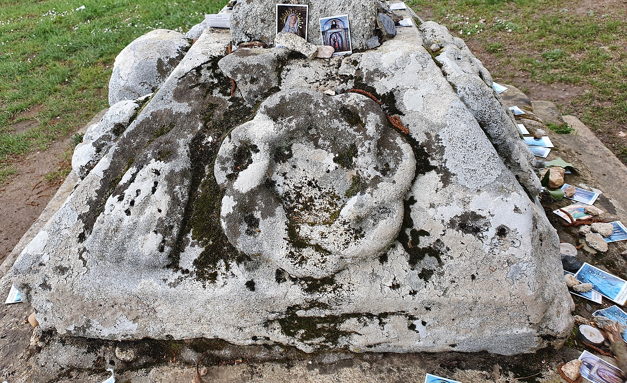 리곤데 마을에는 갈리시아 지방에서 가장 특이하다고 할 수 있는 라메이로스 꾸루세이로(Cruceiro de Lameiros) 십자가상이 있습니다. 십자가상에는 한편에는 그리스도의 고난을 상징하는 망치, 못, 가시관, 해골, 십자가가 조각되어 있고 반대편에는 팔에 아기 예수를 안은 성모 마리아가 조각되어 있습니다. 17세기에 만들어졌다고 하는데 조각된 모습이 많이 훼손되어 자세히 보아야 그 형태를 찾아볼 수 있습니다. 순례자들이 올려놓은 쪽지와 돌들이 주변에 놓여 있습니다. 이제 까미노 순례길을 끝내야 하는 아쉬움 등을 적은 것이겠지요.....
