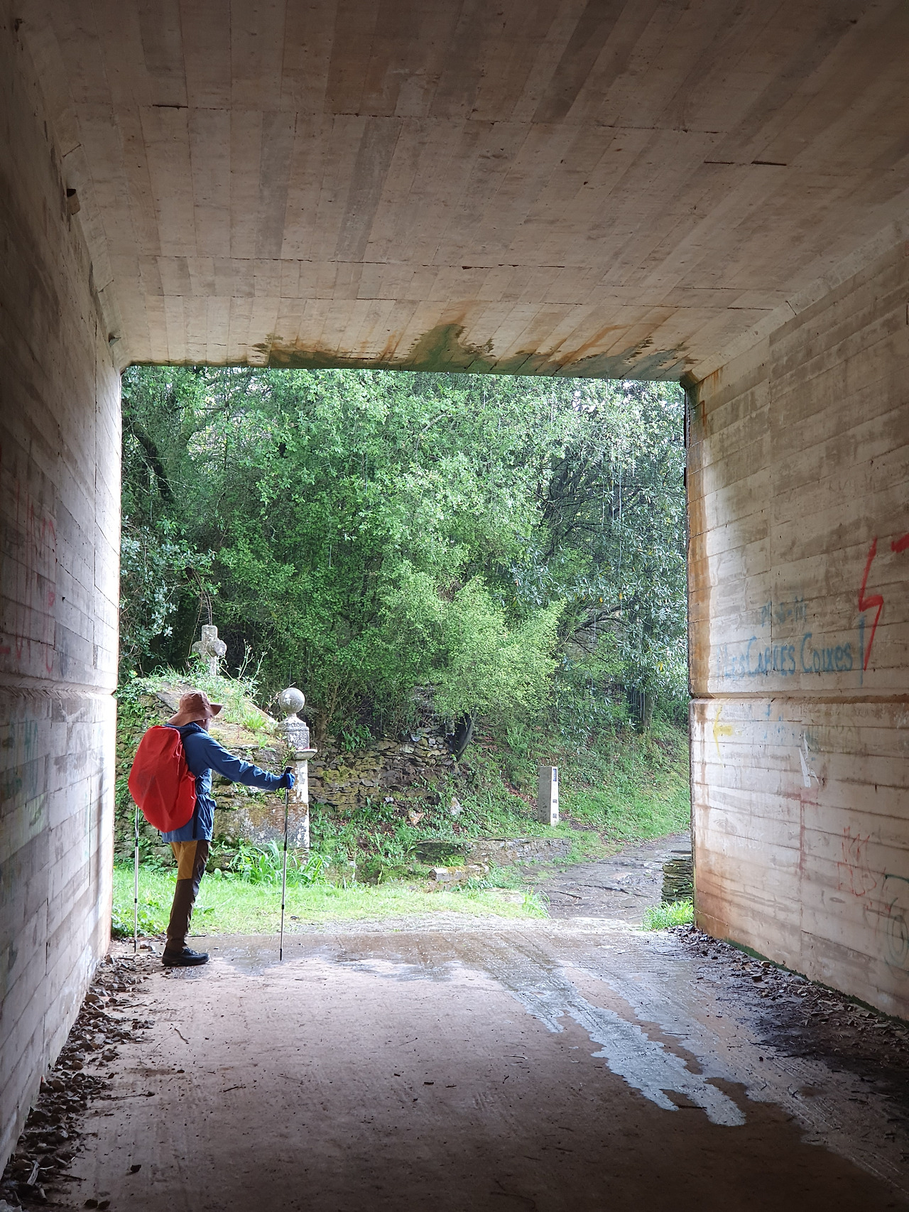 얼마를 걸었을까? 진창길을 피해 걷느라 신경이 쓰인다. 생각해 보니 우리 등산화는 발이 편하고 방수도 잘되어 눈길과 빗길을 오래 걷고 난 뒤에도 발이 젖지 않고 물집 한 번 잡힌 적 없으니 참 고마운 신발이다. 이런저런 생각을 하며 걷는데 또 한차례 먹구름이 지나가며 소낙비를 뿌린다. 마침 굴다리가 있어 비도 긋고 다리도 쉬어간다. 비가 그쳐 마침 지나가는 학생 순례단의 뒤를 따른다. 재잘거리고 장난을 치는 아이들의 발걸음이 더욱 경쾌하다. 오 페드로우스(O Pedrouzo) 마을이 나오고, 학생들은 오늘 이곳에서 머물기 위해 숙소로 향한다. 우리는 쉬지 않고 내쳐 걷는다.
