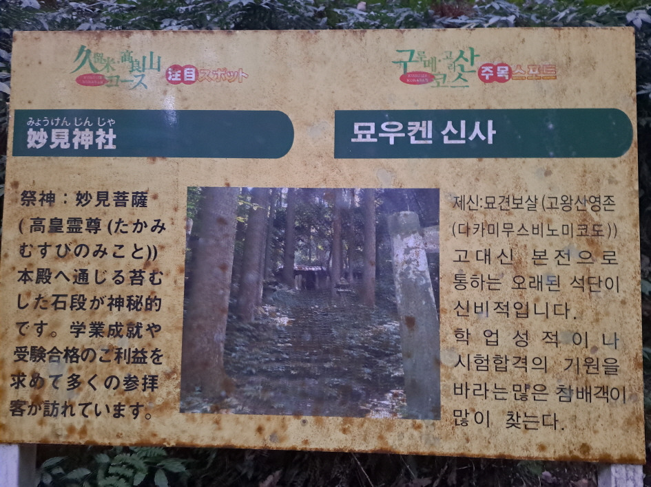길을 잘못 들어 일찍 본 탓에 건너뛰고 아래로 내려오니 이끼가 잔뜩 낀 나무들 사이로 아주 작은 묘우켄 신사(妙見神社)의 표지판이 보인다. 학업 성적이나 시험합격의 영험이 있는 곳이라고 쓰여 있다. 시간이 저물어 어둑해지고 있다고 채근하는 남편의 말을 못 들은 체하고 신사로 들어가 둘째 사위의 취업시험 합격을 기원한다.
