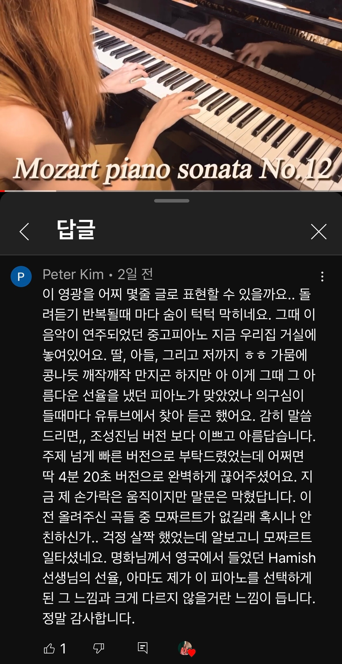 모든 곡은 사람마다 만나는 지점에서 각기 다른 색체와 향기와 기억을 갖는다. 내가 연주한 모차르트 소나타 12번 2악장은 다른 누군가의 기억의 조각과 섞여 새로운 화학반응을 일으켰고, Peter Kim 이 남긴 댓글로 나는 그 화학반응의 실체를 어렴풋이 느낄 수 있었다. 그리고 그것은 나에게 또 다른 연쇄 화학반응을 일으켰다. 감정의 전이.