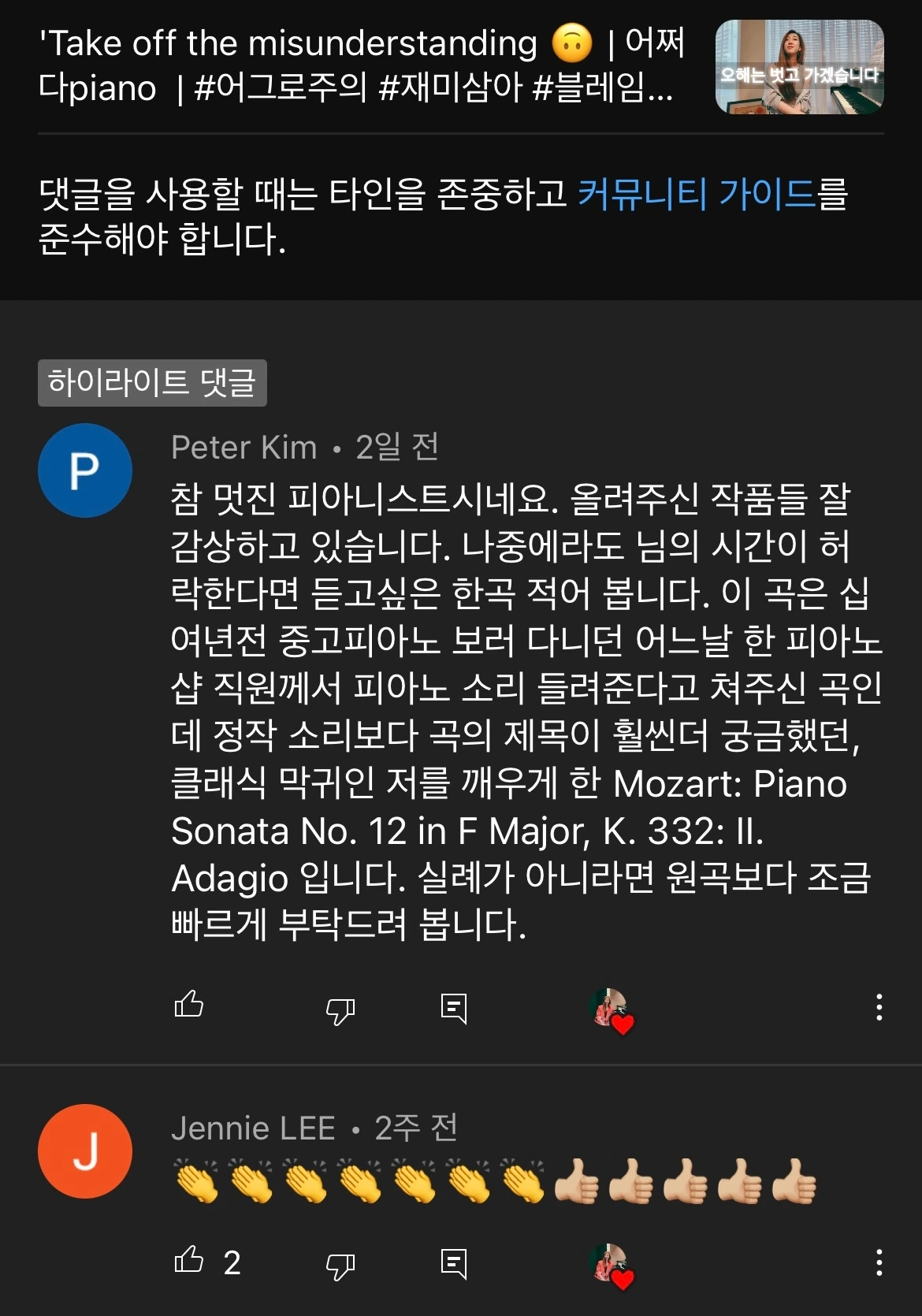 내가 이렇게 감동을 먹으려고 연주 영상을 올린 것도 아닌데 나도 모르게 울컥했다. 누군가 내 가는 길을 지지하지 않는다 할지라고, 나의 삽질이 돈으로 환산되는 값어치를 만들어내지 못할지라도 사람은 떡(돈)으로만 사는 것이 아닌 영혼의 감동과 위로가 필요하다는 점에서 나의 수고로움에 스스로 토닥토닥해주는 순간이었다.
