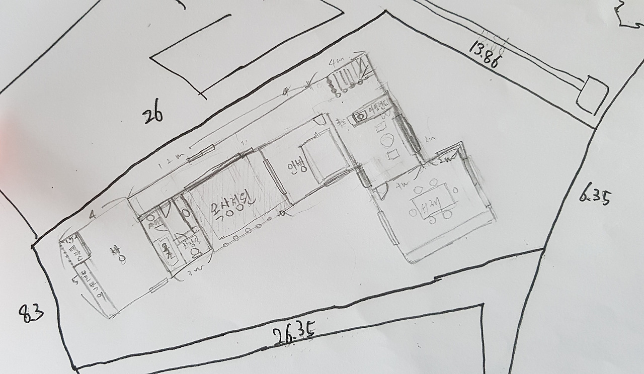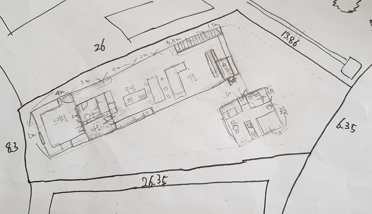 막상 그림을 그려보니 우리 땅이 왜이리 작은지 모르겠다. 마음을 다잡고 현실적으로 돌아와 꼭 넣어야 되는 것들만 그리기 시작했다. 그렇게 우리가 생각했던 우리의 집을 대략 스케치를 해보니 대충 100평 정도는 되는거 같다. 안되겠다. 왜 이리 크지? 우리가 생각했던 부분을 적기만 해서 전문가가 설계를 해주시는게 맞겠다. 그렇게 우리는 나름대로 우리의 로망들을 기록하여 설계사에 보냈다.
