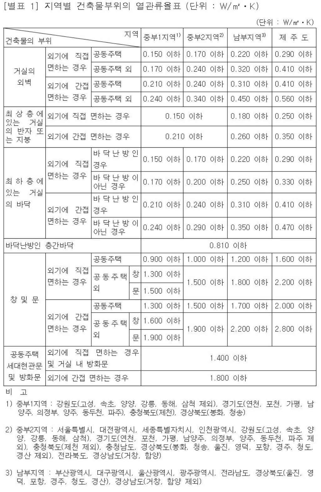 < 건축물의 에너지 절약 설계기준 별표1 지역별 열관류율표 >