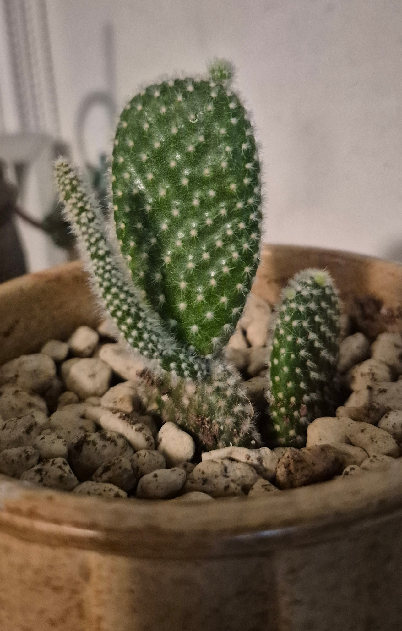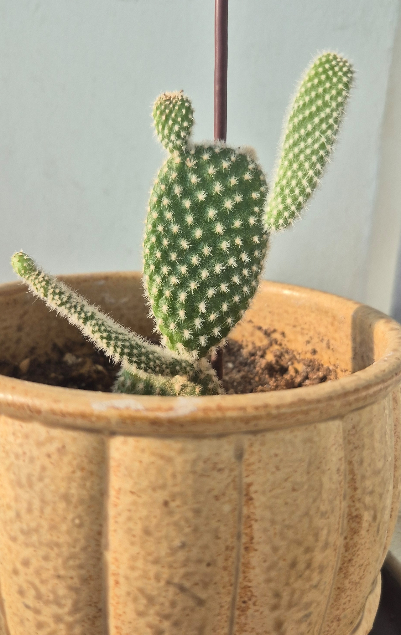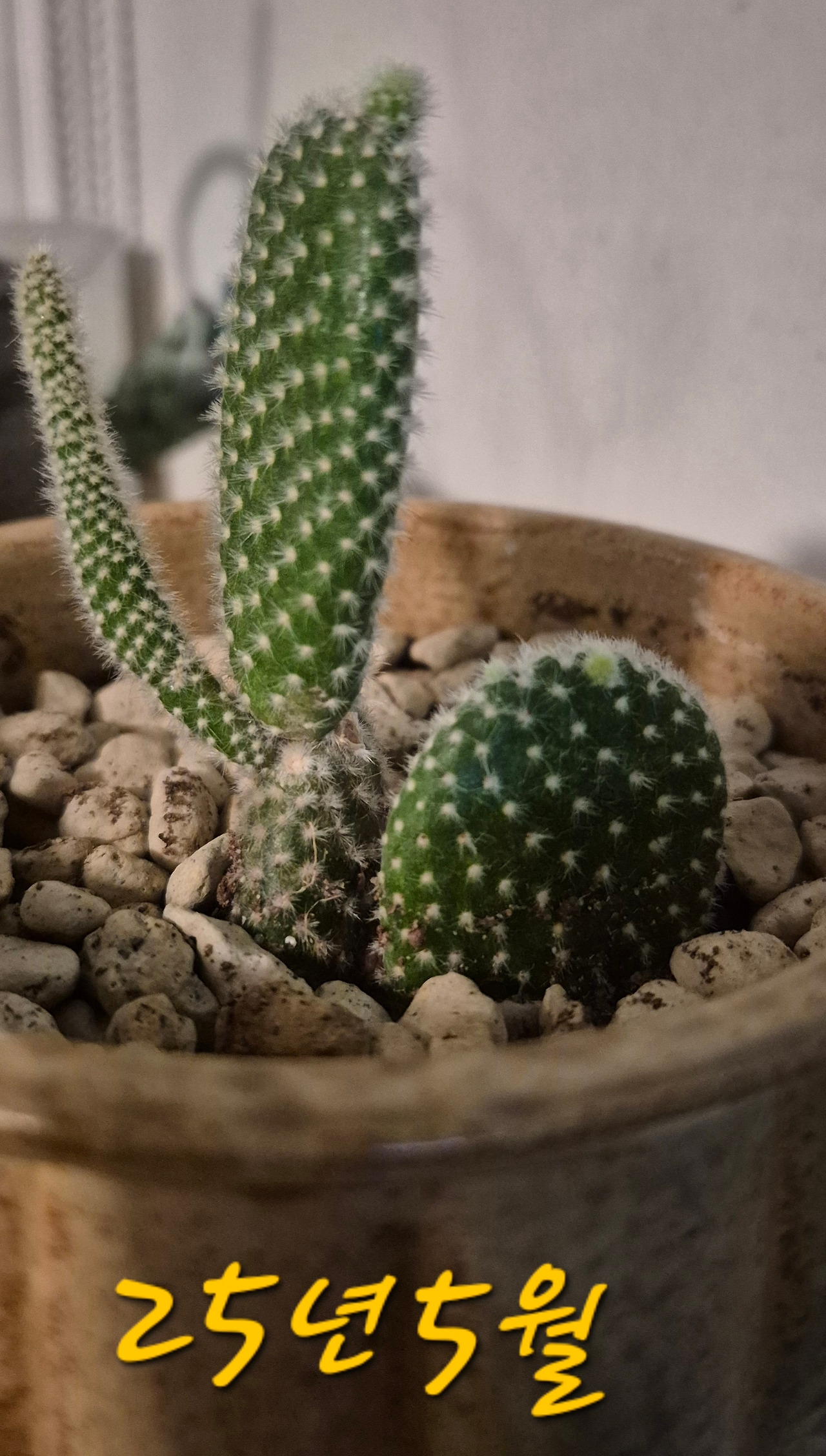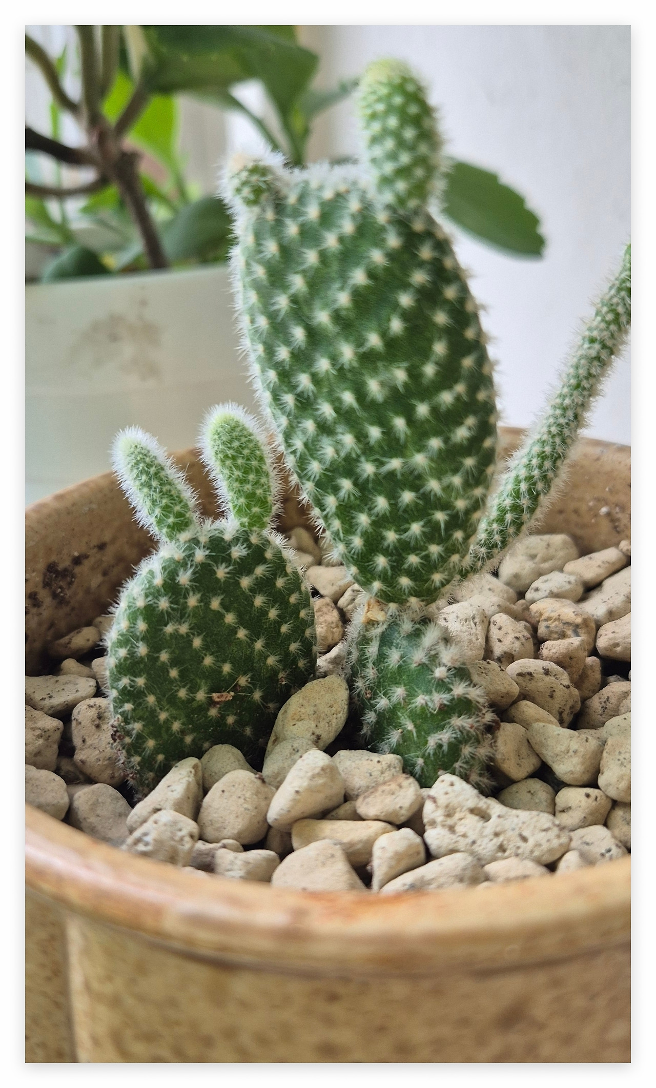 백도선은 꽃보다도 그 특유의 토끼 귀 모양 마디가 새로 돋아나는 과정을 지켜보는 재미가 더 큰 식물입니다. 지금 위로 길쭉하게 올라오는 부분들도 햇빛을 듬뿍 받으면 나중에 그 끝에서 또 다른 작은 귀들이 쏙쏙 올라올 거예요.