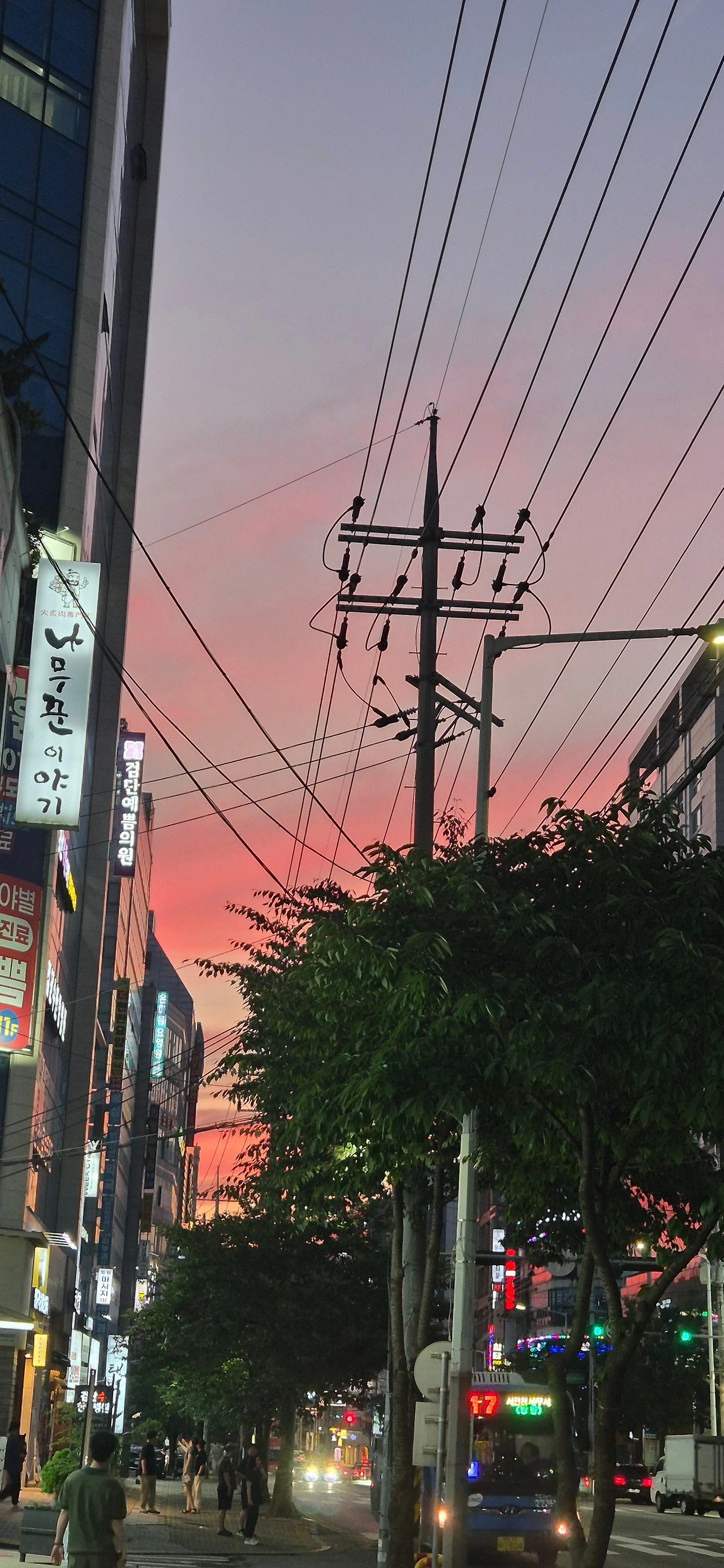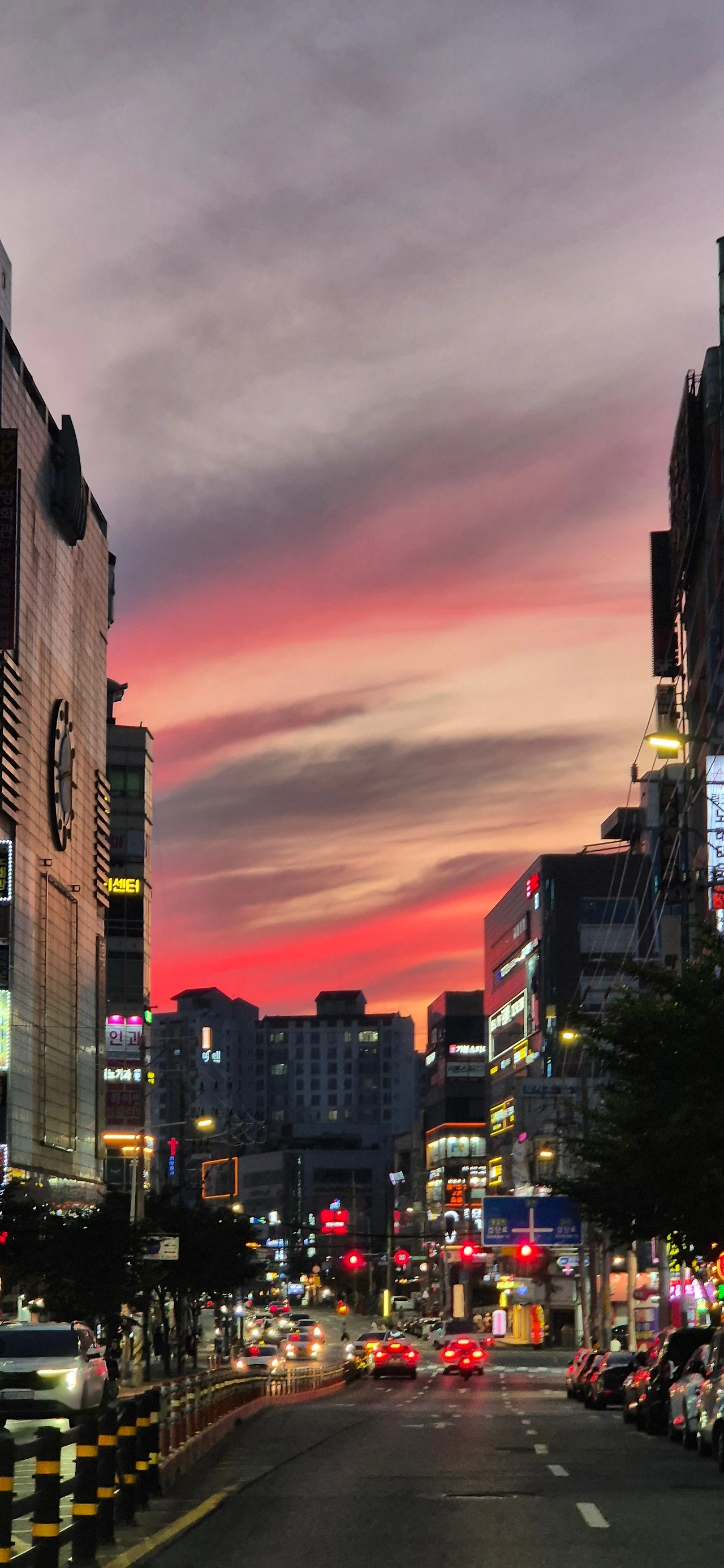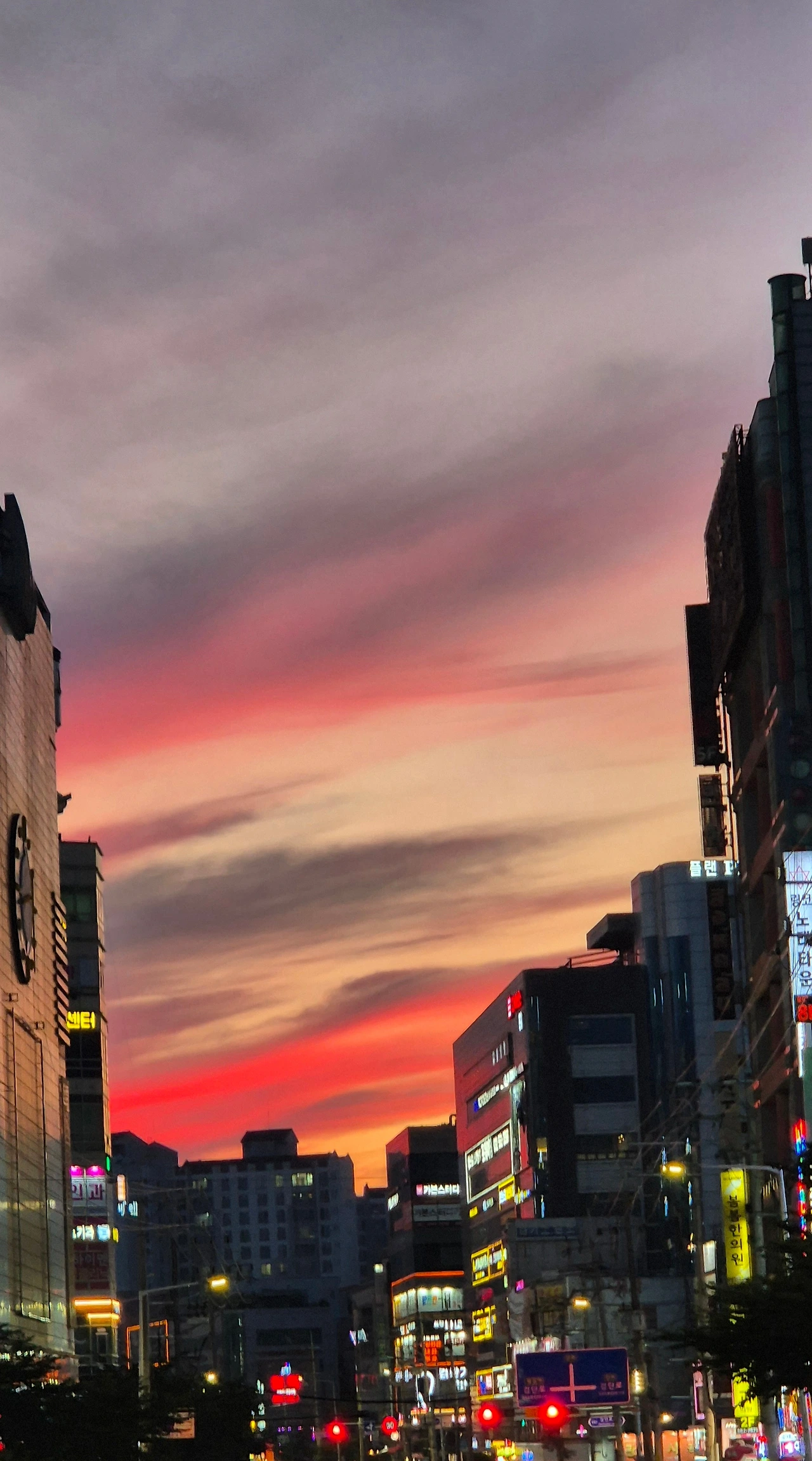 저 날도 남편과 오랜만에 해물찜을 배 터지게 먹고 나오던 찰나에 본 석양으로 물든 하늘이 너무 예뻐서 횡단보도를 건너다 찍어본 사진이에요.