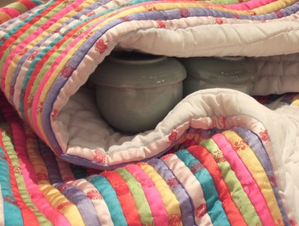 밥공덕은 그런 평범한 여인들의 궁리와 필요가 만들어낸 핸드메이드 물건이다. 패브릭(견)과 패브릭(견) 사이 솜을 덧대고 누빈다. 솜 누빈 밥공덕은 진공까지는 아니더라도 제법 효능이 좋다. 패브릭과 밥그릇 사이 공간은 외부 온도를 차단하여 보온 도시락 같은 역할을 한다. 적어도 따뜻한 밥을 2~3시간 동안은 김이 폴폴 나는 상태로 유지시켜 준다.