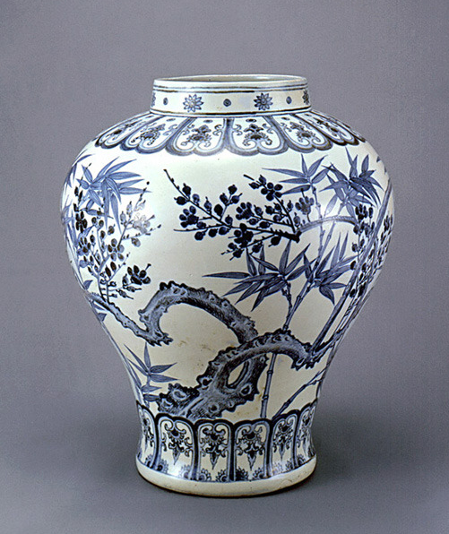 조선 선비들이 충효, 기개의 상징으로 여겼던 동정추뤌, 대나무, 매화 등의 도안이 전문도공의 대담하고 수려한 필치로 그려졌다.