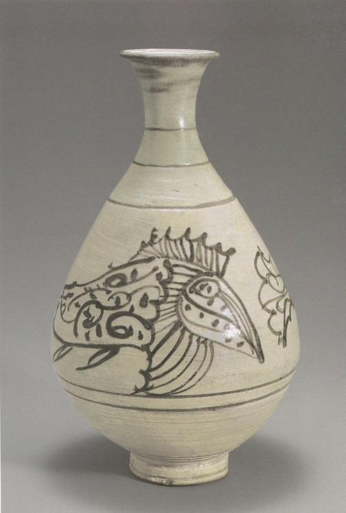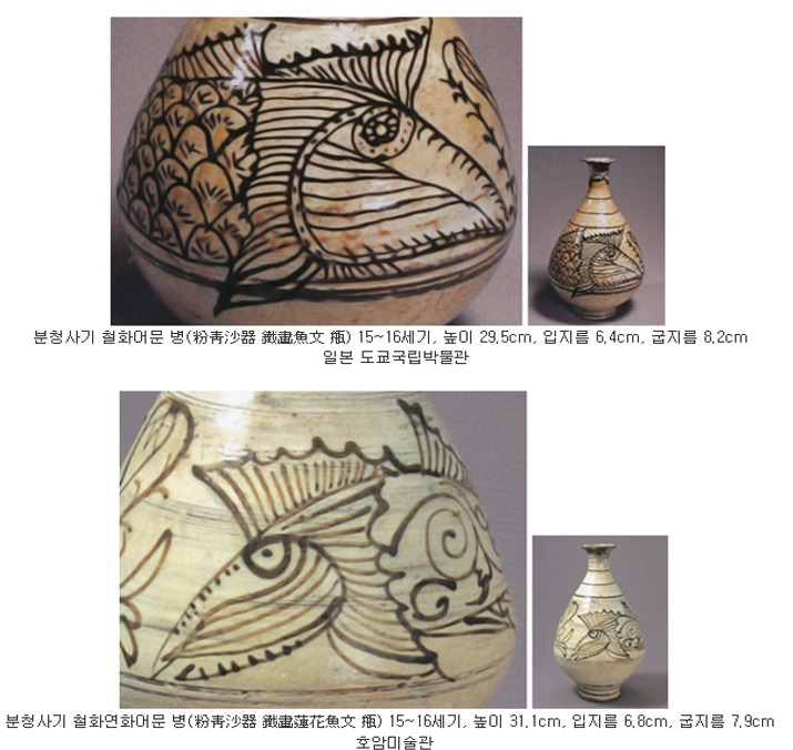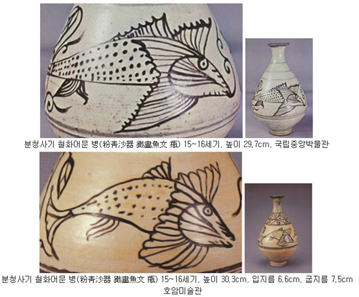 이것은 15-16세기 충북 계룡산에서 제작되었던 철화 분청에도 여지없이 발견됩니다. 지금 보시는 <분청사기철화어문병(粉靑沙器 鐵畵魚文甁)>의 배부분에는 물고기가 그려져 있습니다. 동체 전면에 백토로 귀얄칠을 하고 산화철로 문양을 그린 전형적인 계룡산분청병입니다. 다른 <분청사기철화어문병>의 다채로운 어문의 표현들을 보실까요? 대부분 물고기의 몸체는 길게 과장되고 주병을 한 바퀴 쉬이 돌고 있습니다. 입부분과 지느러미를 과장되게 묘사하여 힘차게 그려져 있습니다. 어떤 것은 비늘의 결을 일일이 묘사한 것도 있고 당초문이나 물결무늬로 채우거나 아예 점으로 찍고 만 것도 있습니다.