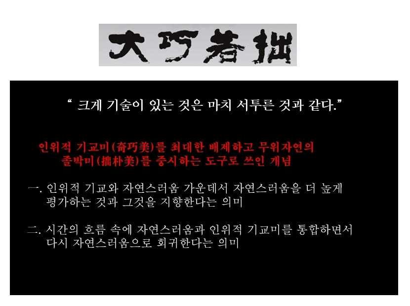 대교약졸은 노장사상의 중요한 심미 이론의 하나로 중국 예술 특히 문학에서 인위적 기교미(奇巧美)를 최대한 배제하고 무위자연의 졸박미(拙朴美)를 중시하는 도구로 쓰였던 개념입니다. 대교약졸 속에는 두 가지 의미가 있는데, 첫째는 인위적 기교와 자연스러움 가운데서 자연스러움을 더 높게 평가하는 것이며 그것을 지향한다는 의미입니다. 두 번째는 시간의 흐름 속에 자연스러움과 인위적 기교미를 통합하면서 다시 자연스러움으로 회귀한다는 의미가 있습니다. 중국에서 발아한 대교약졸은 동북아시아 문화권의 아름다움을 설명하는데 보편적 개념으로 진화합니다. 국내 중국문학 학자인 박석 교수는 다음과 같이 한국 미술의 대교약졸을 중국의 것과 비교하여 설명하기도 하였습니다.