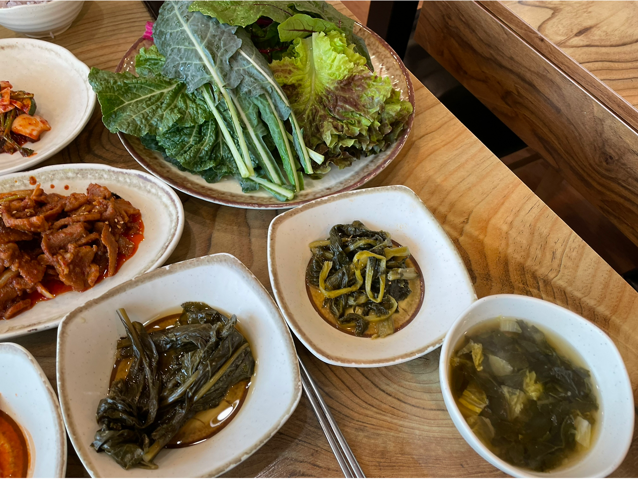 모든 반찬이 간이 딱 알맞고 새콤달콤해서 밥은 쌈이랑 먹고 나머지 반찬은 누룽지와 같이 먹기 딱 좋은 반찬들로만 구성이 되어있다. 반찬은 일부러 잔반 남기지 않는 운동에 동참하기 위해 적정량보다 조금 소량으로 담았기 때문에 추가로 언제든지 리필해서 먹을 수 있다.
