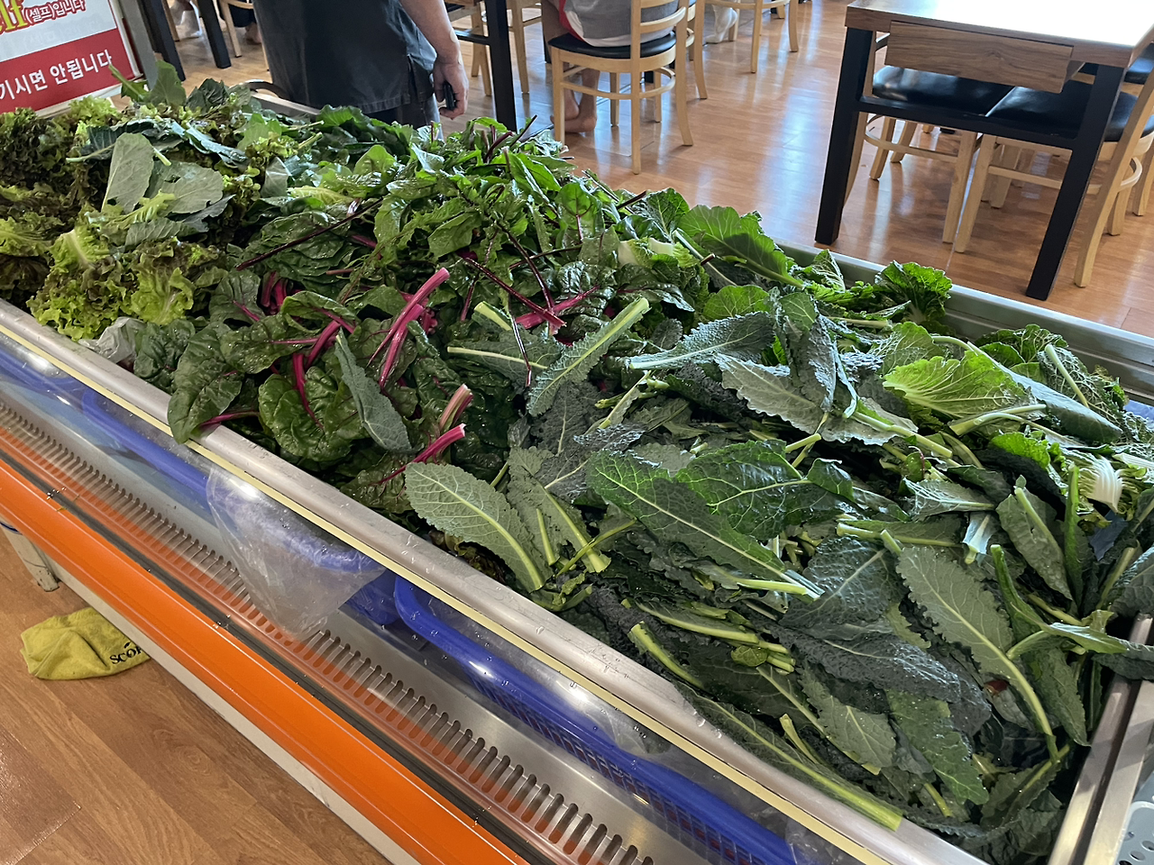 그리고 한 켠에는 이렇게 엄청난 쌈 무덤을 쌓아뒀다. 갓 따온 싱싱한 쌈을 몇 무더기를 먹어도 상관없다. 요즘처럼 쌈채소 가격이 비쌀 때 이런 호사를 누릴 수 있다니 너무 좋다. 우리도 한 대접을 가져와서 다 먹었다.