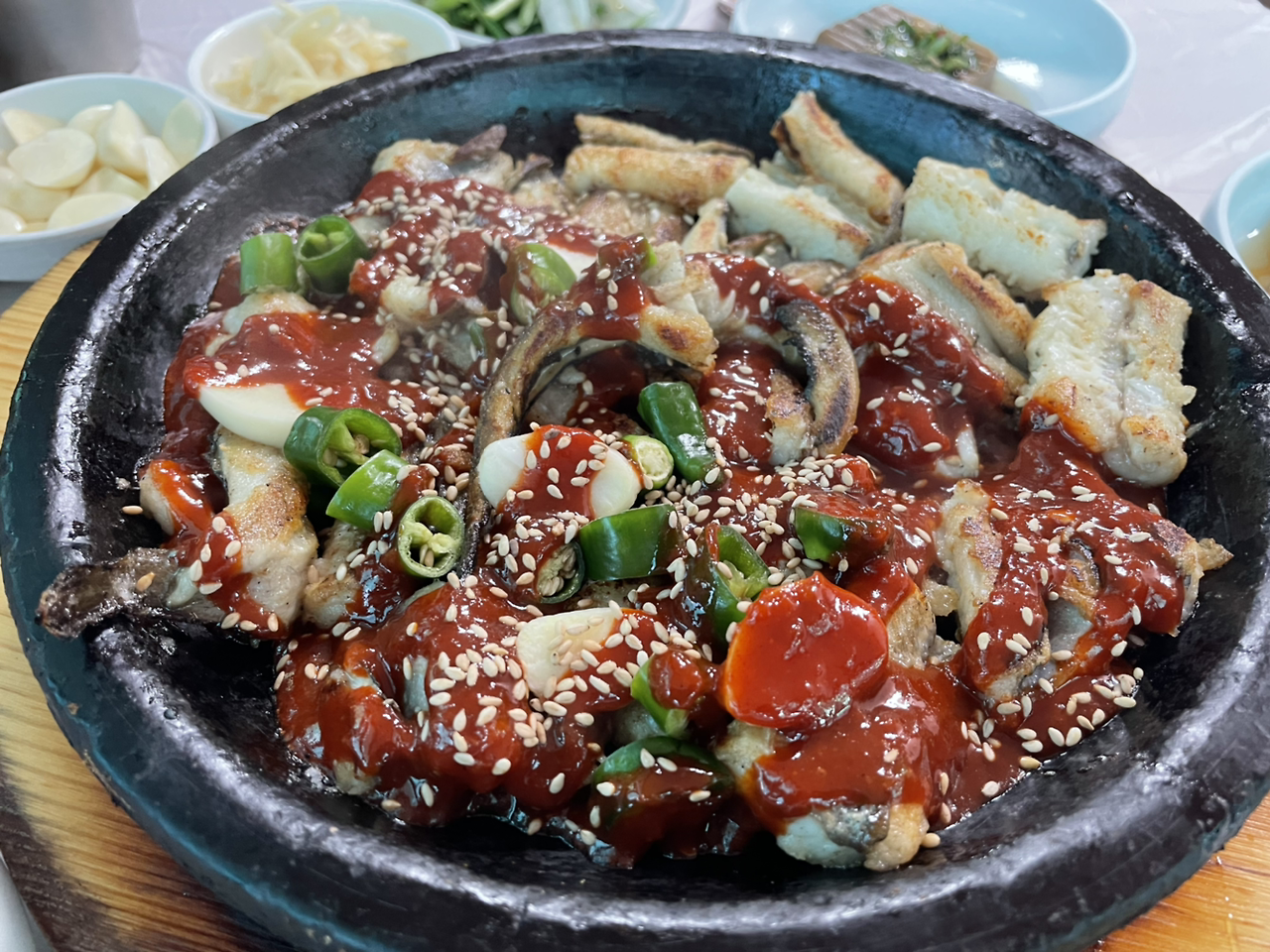 이미 식당 안을 들어가 보니 만석이었고, 딱 두 명 앉을 테이블이 하나 남아서 운 좋게 바로 음식을 시킬 수 있었다. 이곳은 특이하게도 익히 우리가 아는 그런 식의 장어구이가 아니라 돌솥 팬에 숯불 구이식으로 양념이 되어 지글지글 장어가 익혀 나온다.
