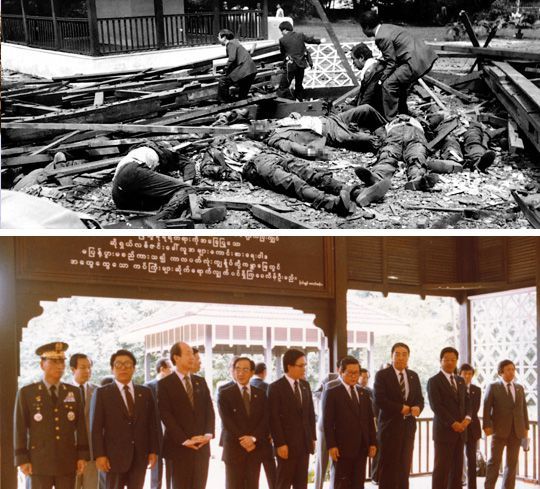 1983년 10월 9일 미얀마에 전두환 대통령과 정부 인사들이 방문하고 랑군에 있는 묘소를 참배할 일정을 잡아놓은 상태에서 북한 측이 설치해놓은 폭발물이 터져 한국인 17명 미얀마 4명 총 21명의 많은 사망자가 나온 사건이다. 이날 전두환 대통령은 차량 문제로 예정된 시간보다 늦게 도착하게 되었는데 먼저 도착한 수행원들이 애국가 예행연습을 하는 도중 북한 측 테러리스트들은 전두환 대통령이 도착한 줄로 오해하고 폭발물을 터트려 전두환 대통령은 피해를 입지 않고 즉각 한국으로 귀국한 사건이다.