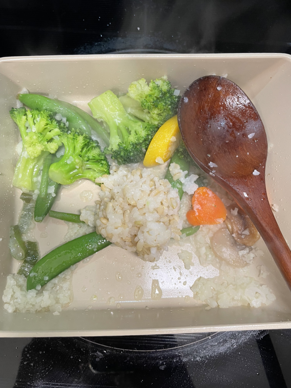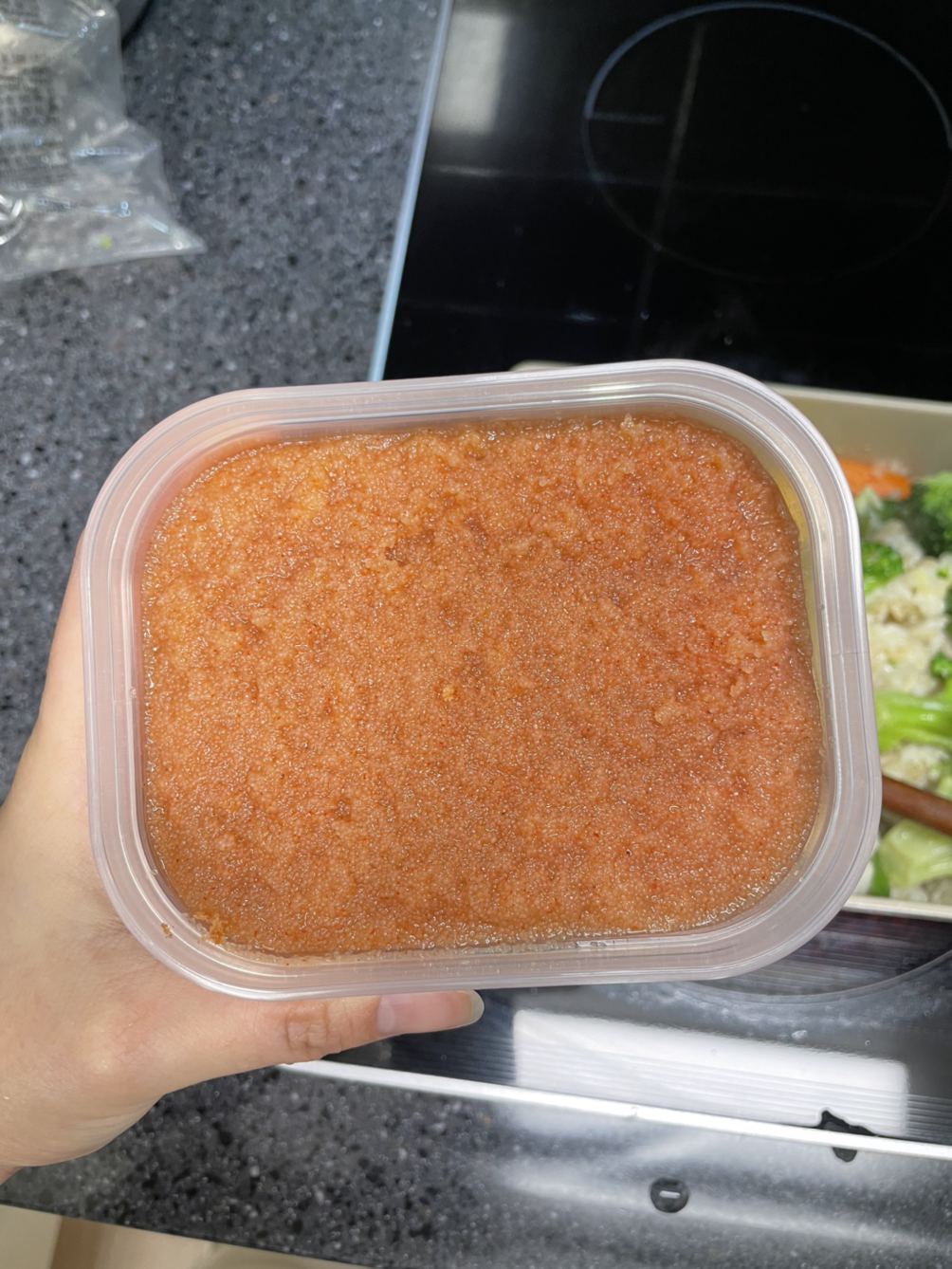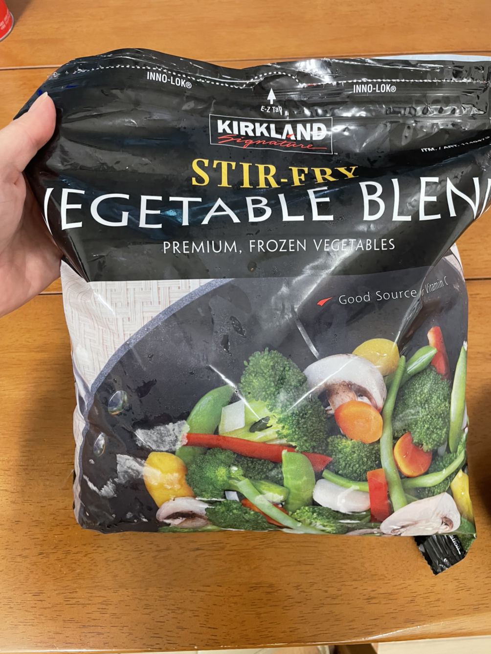 3. 역시나 코스트코 애정템 냉동 야채 한주먹을 물에 담가 녹인 후 채에 받쳐 물기를 빼준다. 이거 말고 흰색 포장지로 되어있는 다른 냉동 야채 상품도 먹어봤는데 이게 더 좋은 듯?!