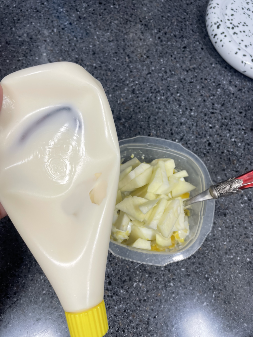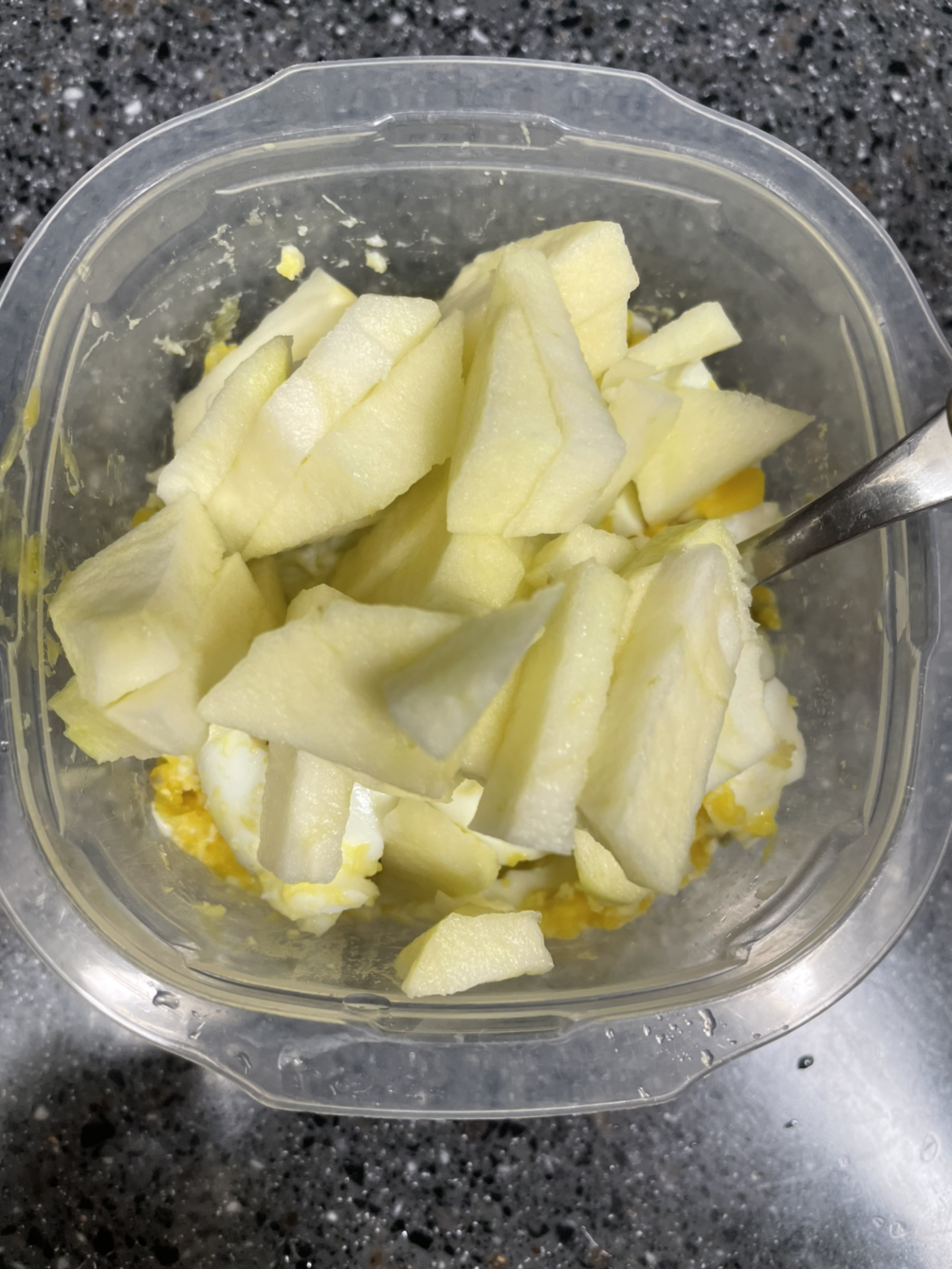 으깬 계란에 사과도 종종 잘게 썰어 넣는다.