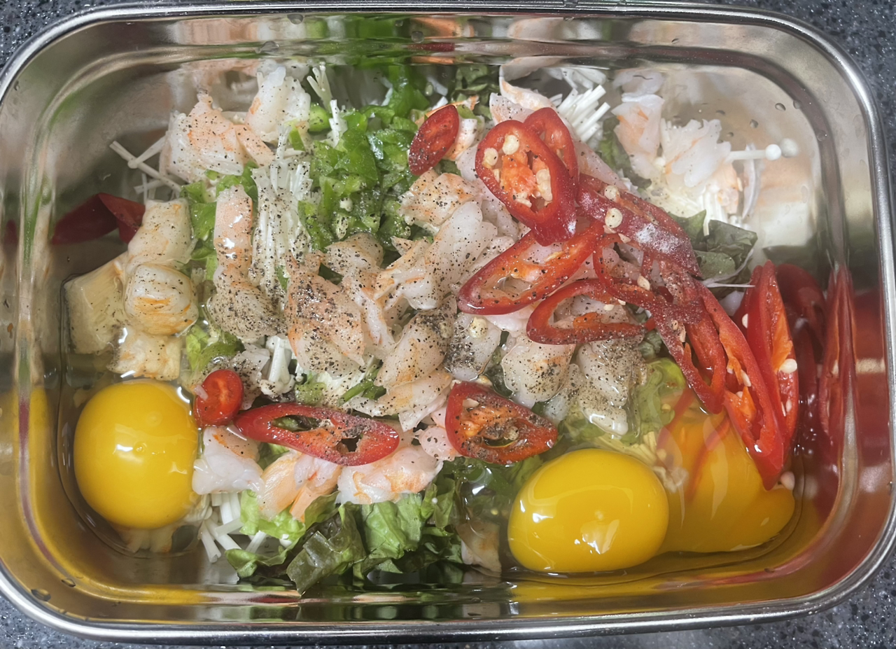 5. 앞에서 손질한 재료를 모두 담고 계란 3개와 메밀가루 세 큰 스푼 탈탈 , 비린맛 잡기 위해 후추도 톡톡