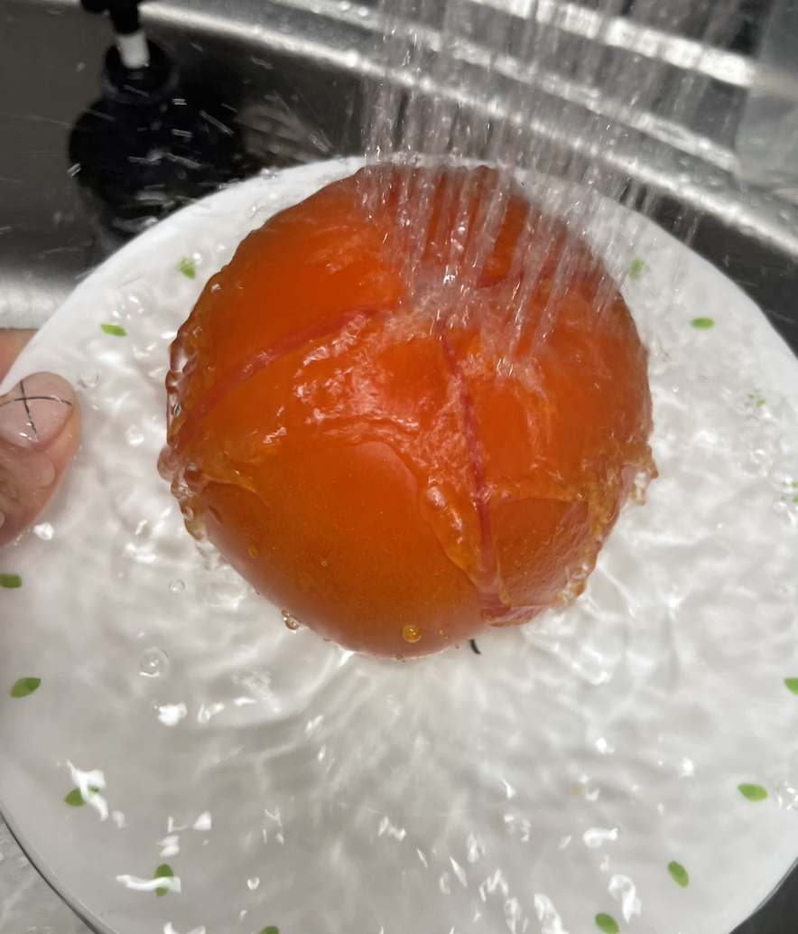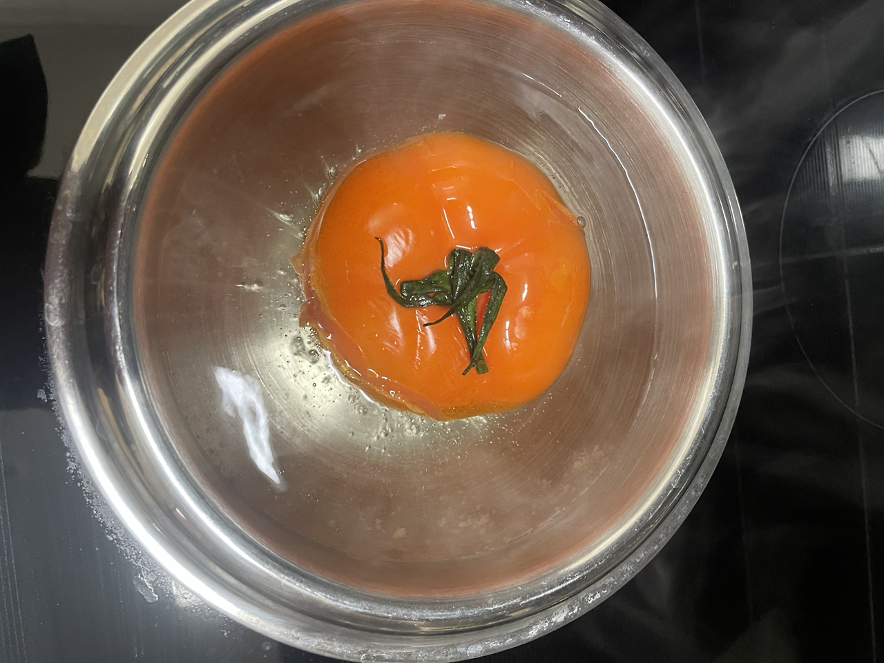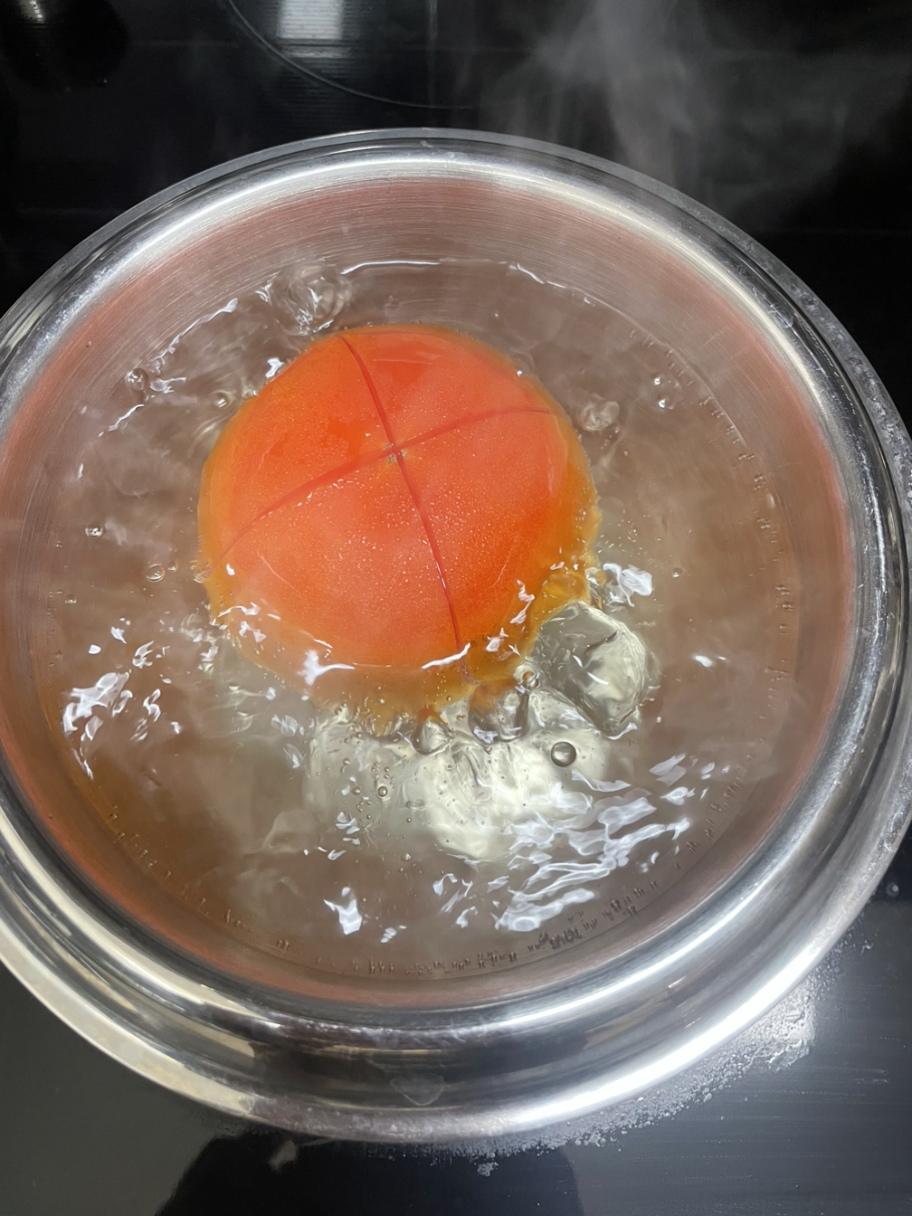 한쪽에 미리 끓여둔 물에 1분간 토마토를 데친다.