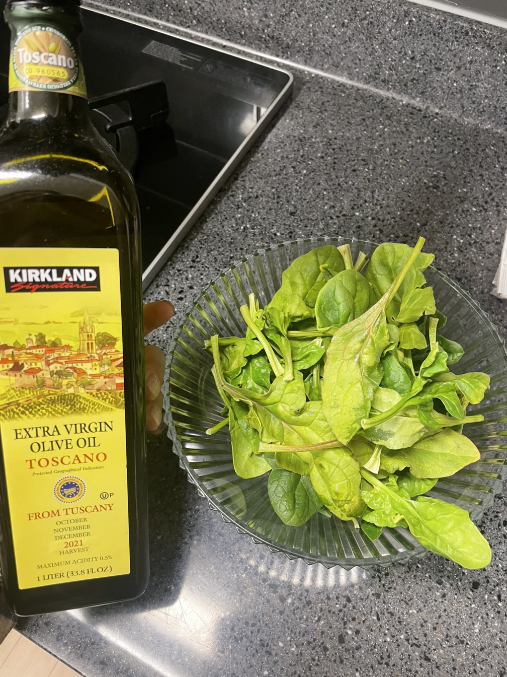 볼에 담아 둔 시금치에 올리브유를 휘휘 둘러 섞어준다.