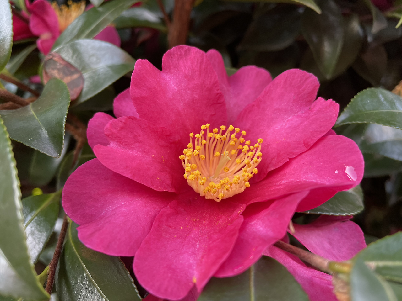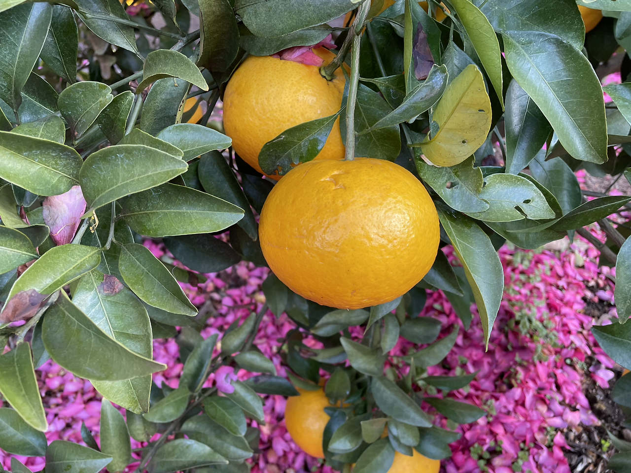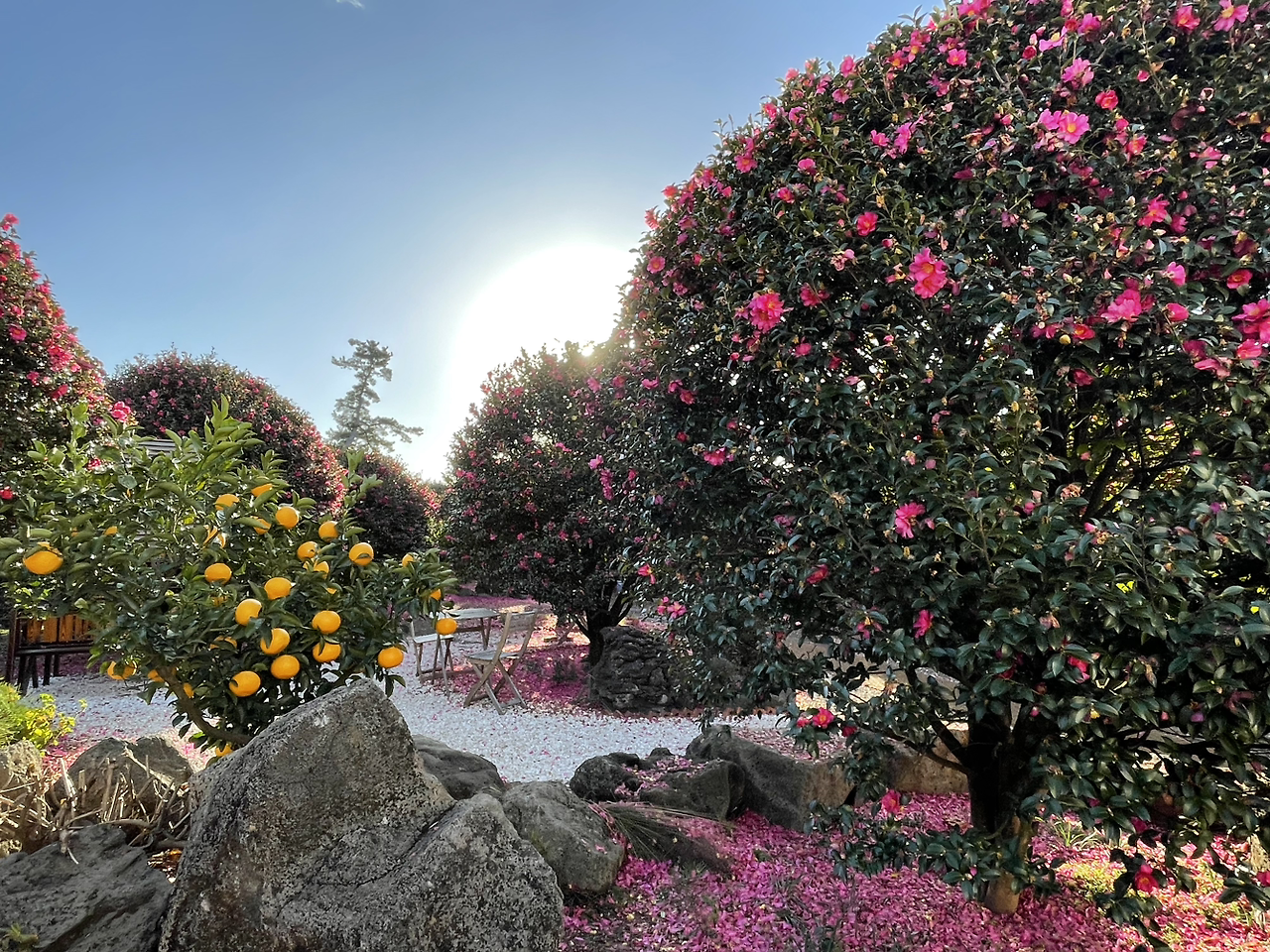 소담한 귤나무의 오렌지 색감과 동백꽃의 핑크가 화사하게 어우러진다