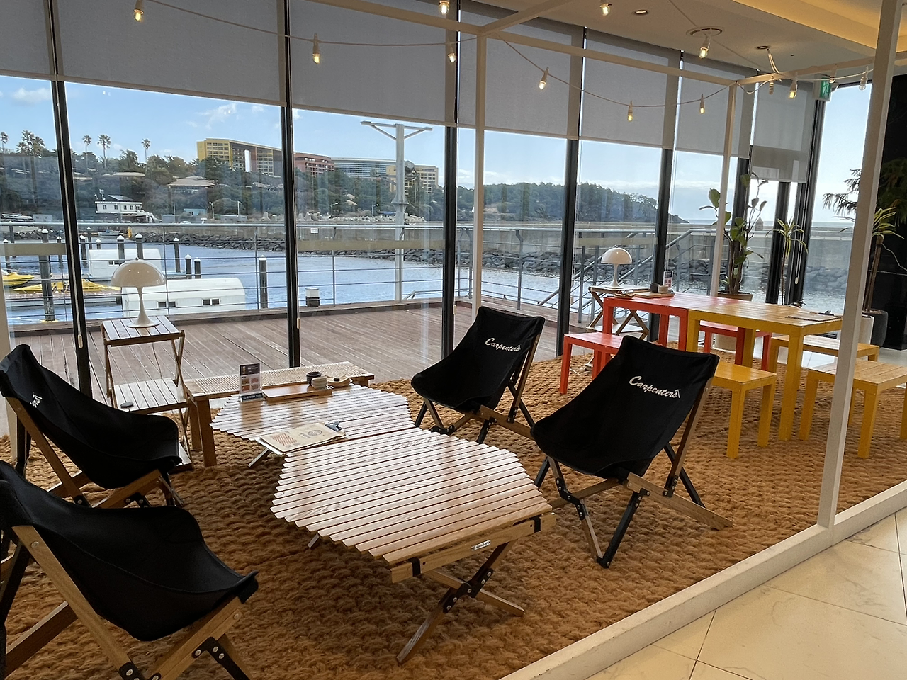 동백포레스트에 가면 카페가 하나 있는데 그 안에 있는 이 통창과 나무 의자가 핫플레이스다