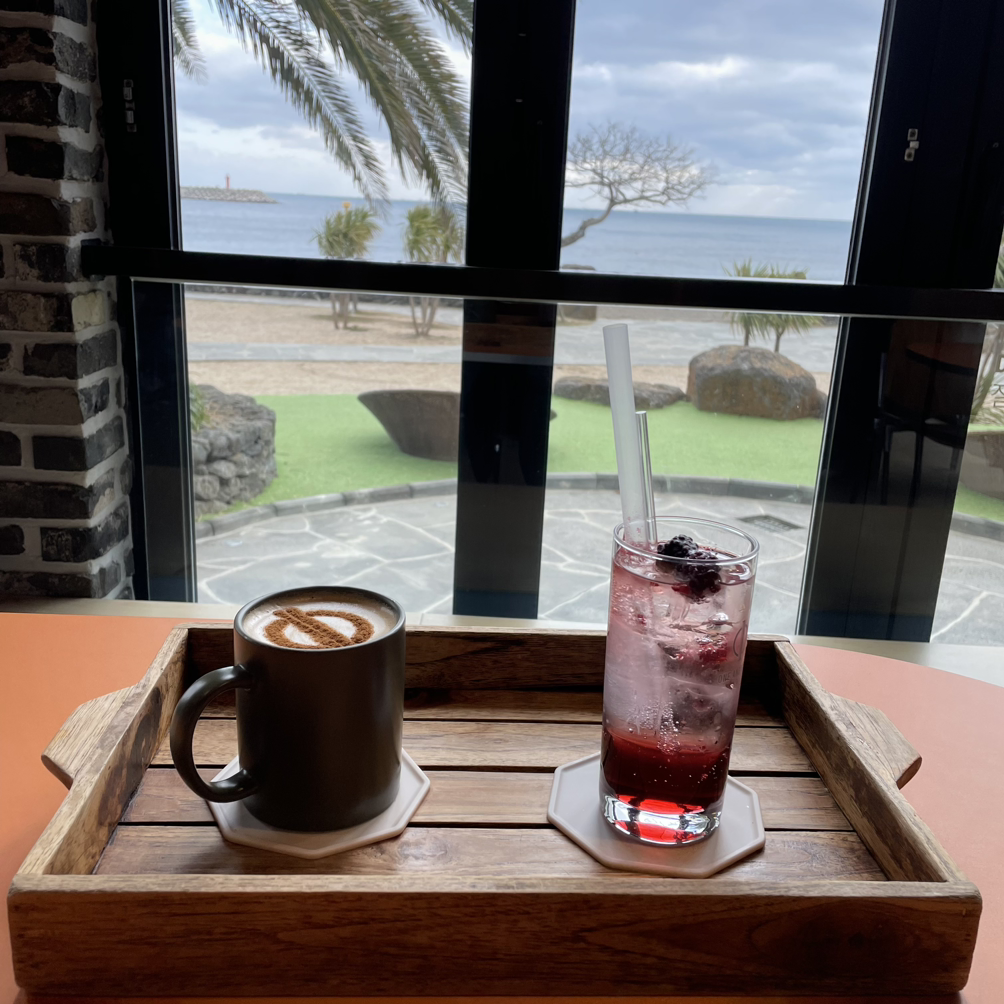 바깥으로 보이는 바다와 뒤에 있는 산방산까지 정말 기가 막힌 카페 위치 선정에 놀랐고, 엄청나게 비싼 음료 값에 두 번 놀랐다.