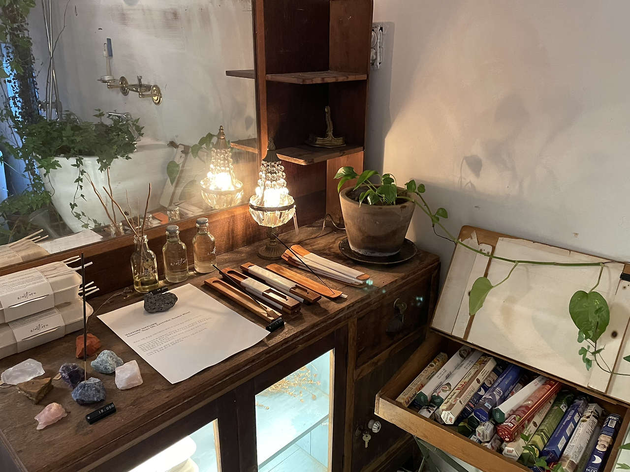 수많은 인센스들과 향초, 향수, 디퓨저들이 전시되어 있다.