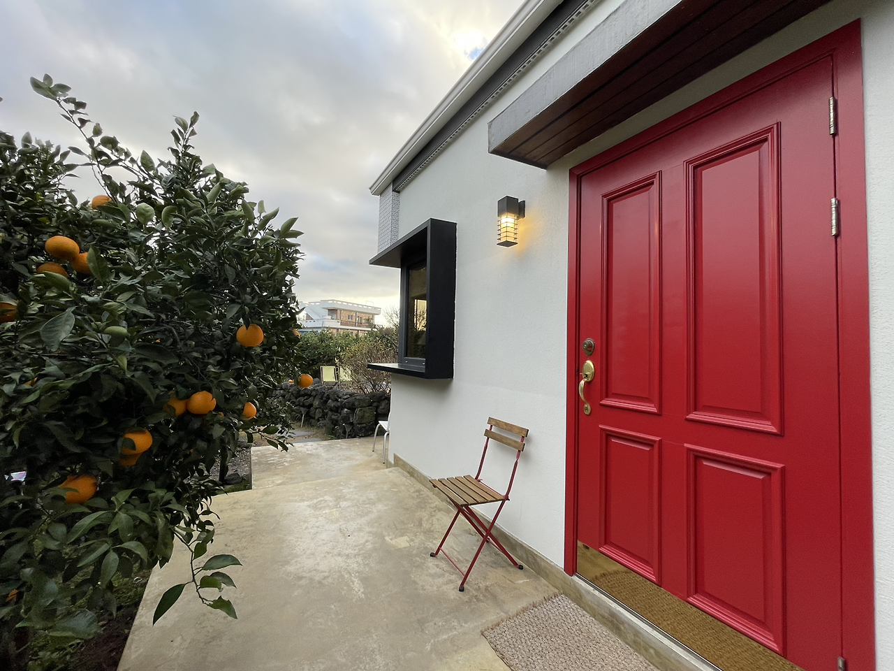 오렌지색 귤나무와 빨간 대문이 참 조화롭다. 생동감을 주는 색깔들.