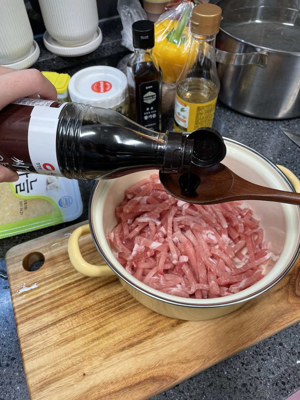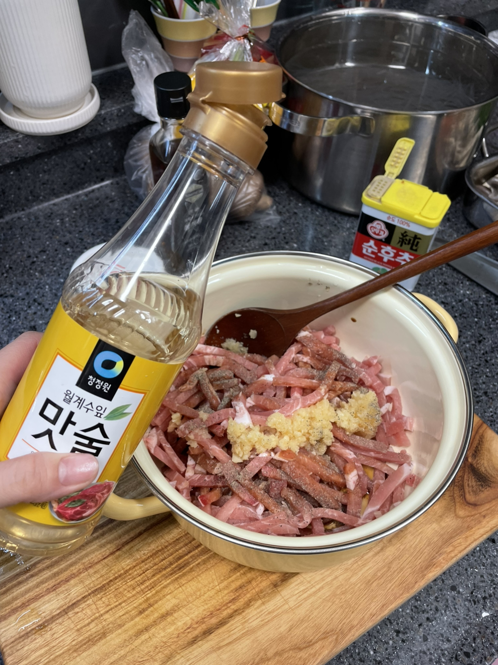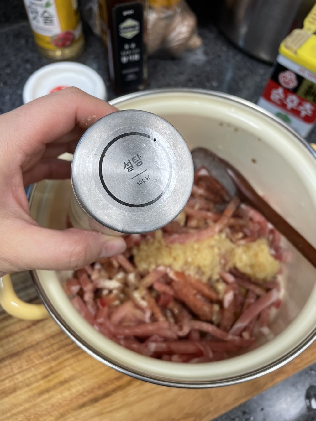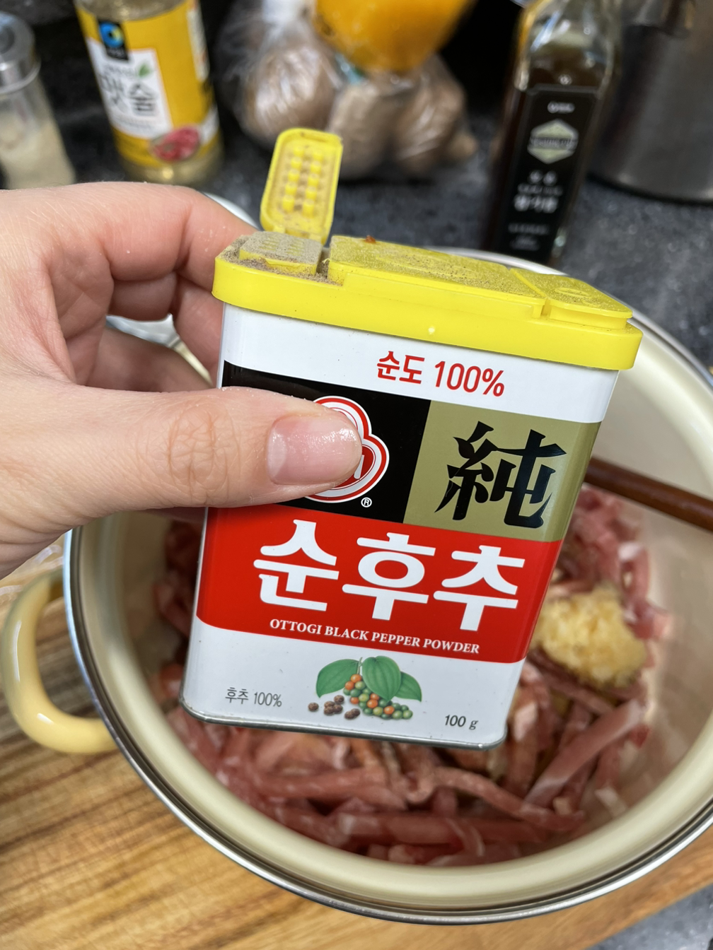 4. 다음은 준비해 둔 잡채용 한돈 총 700g 정도를 준비했다. 보통 고기 넣는 양보다 많이 준비했다. 애매하게 남으면 따로 내가 뭘 더 해 먹지는 않을 것 같아서 두 팩을 다 넣어줬다.
