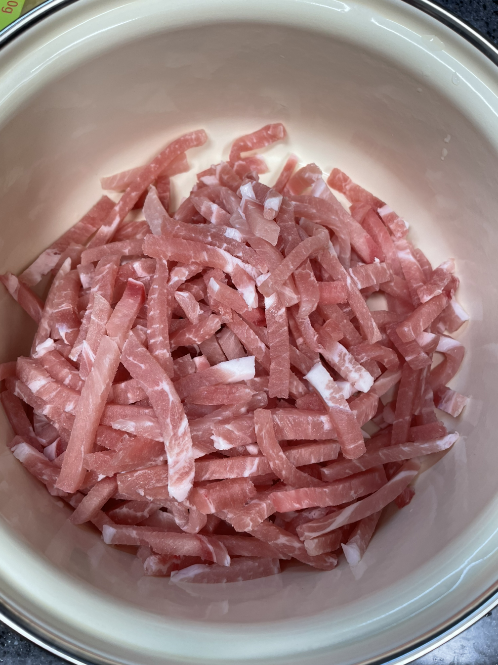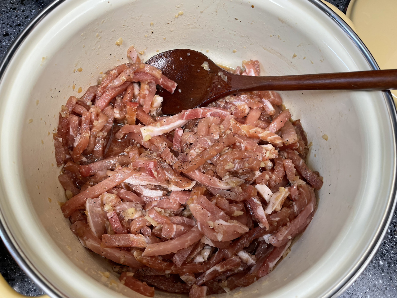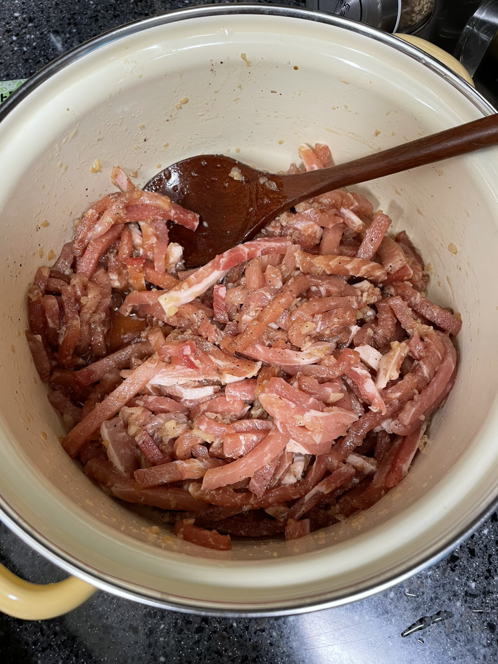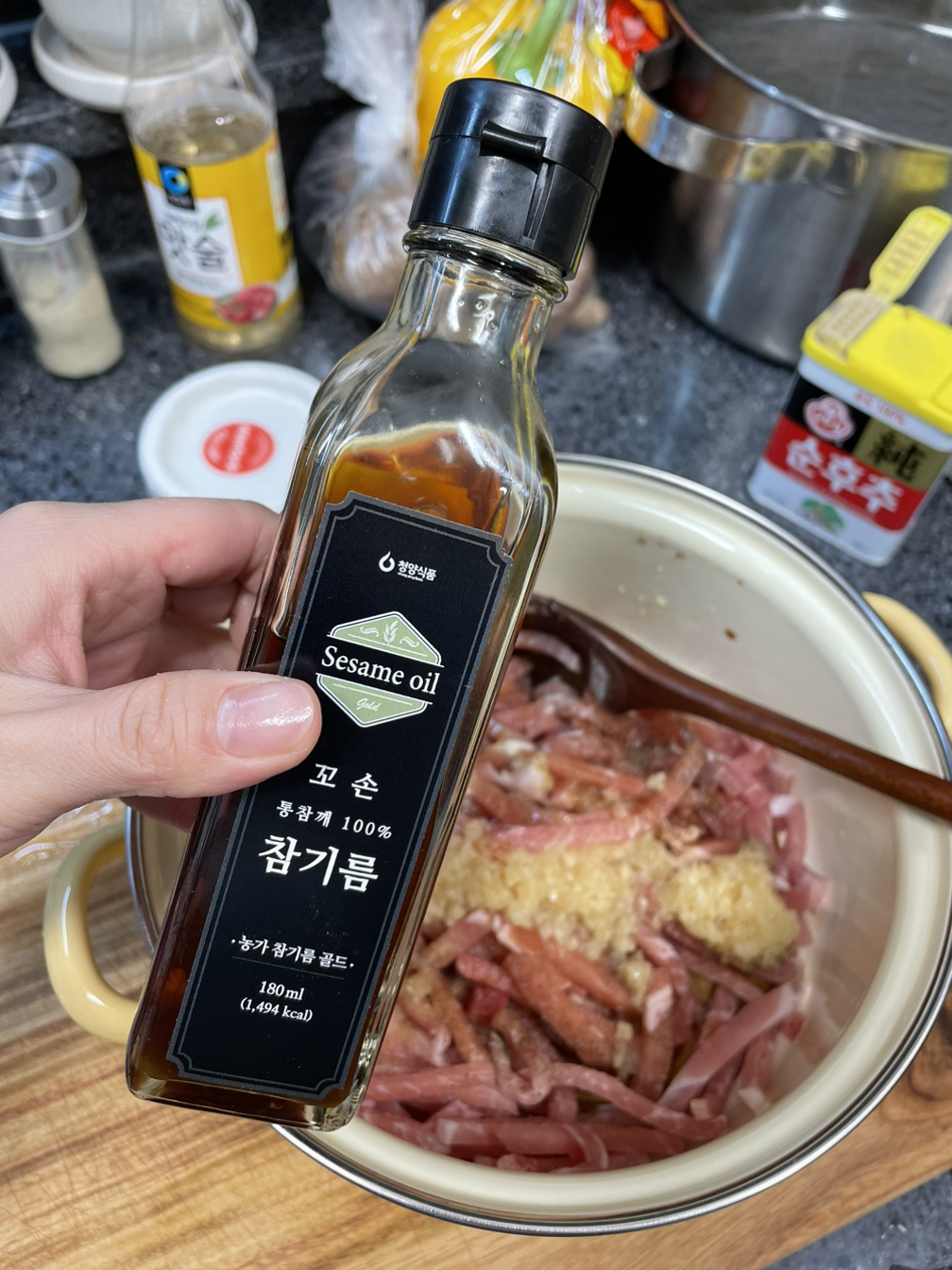 4. 다음은 준비해 둔 잡채용 한돈 총 700g 정도를 준비했다. 보통 고기 넣는 양보다 많이 준비했다. 애매하게 남으면 따로 내가 뭘 더 해 먹지는 않을 것 같아서 두 팩을 다 넣어줬다.