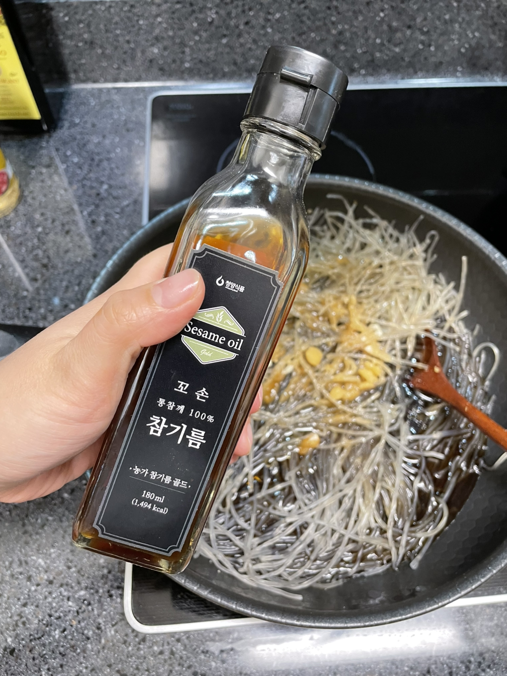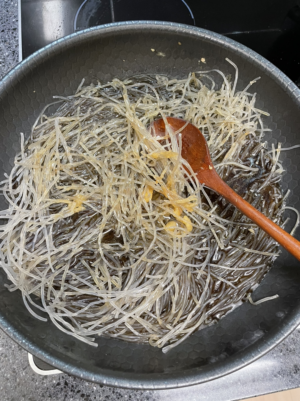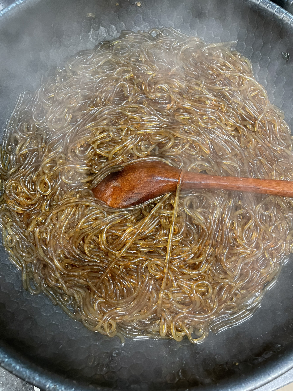 위의 양념을 넣어 양념이 당면에 배어들 때까지 강불에서 저어주며 졸인다.