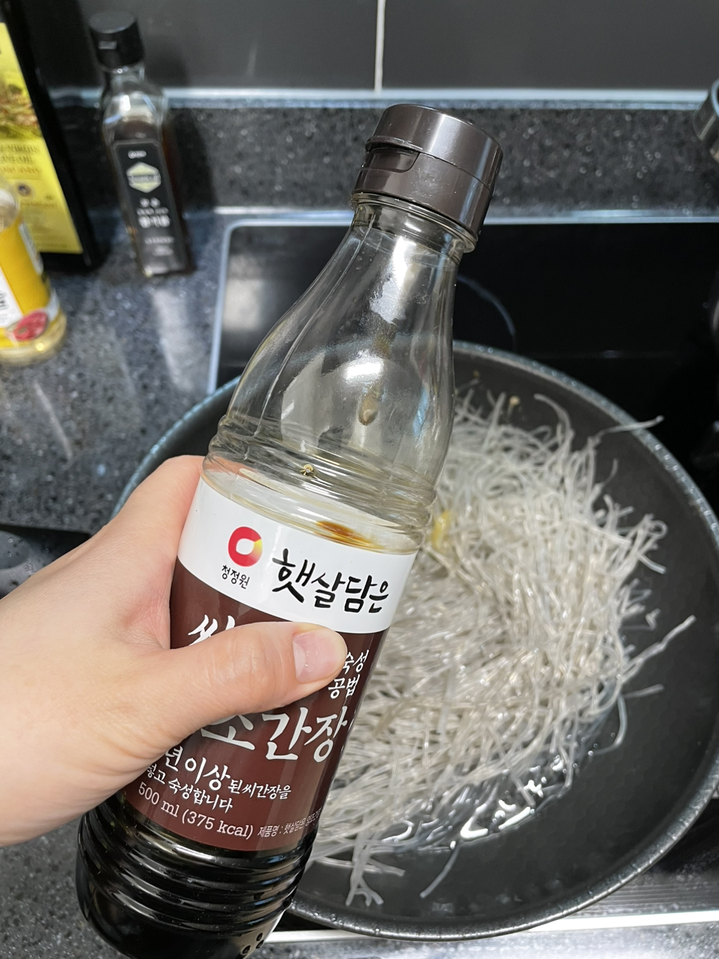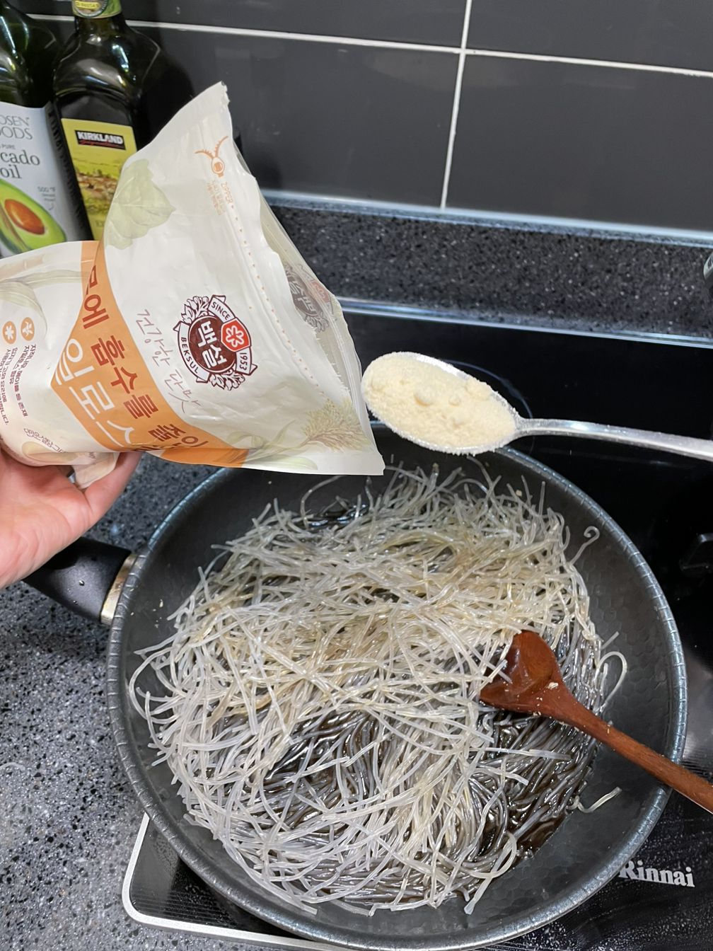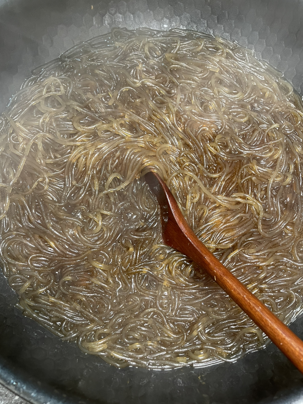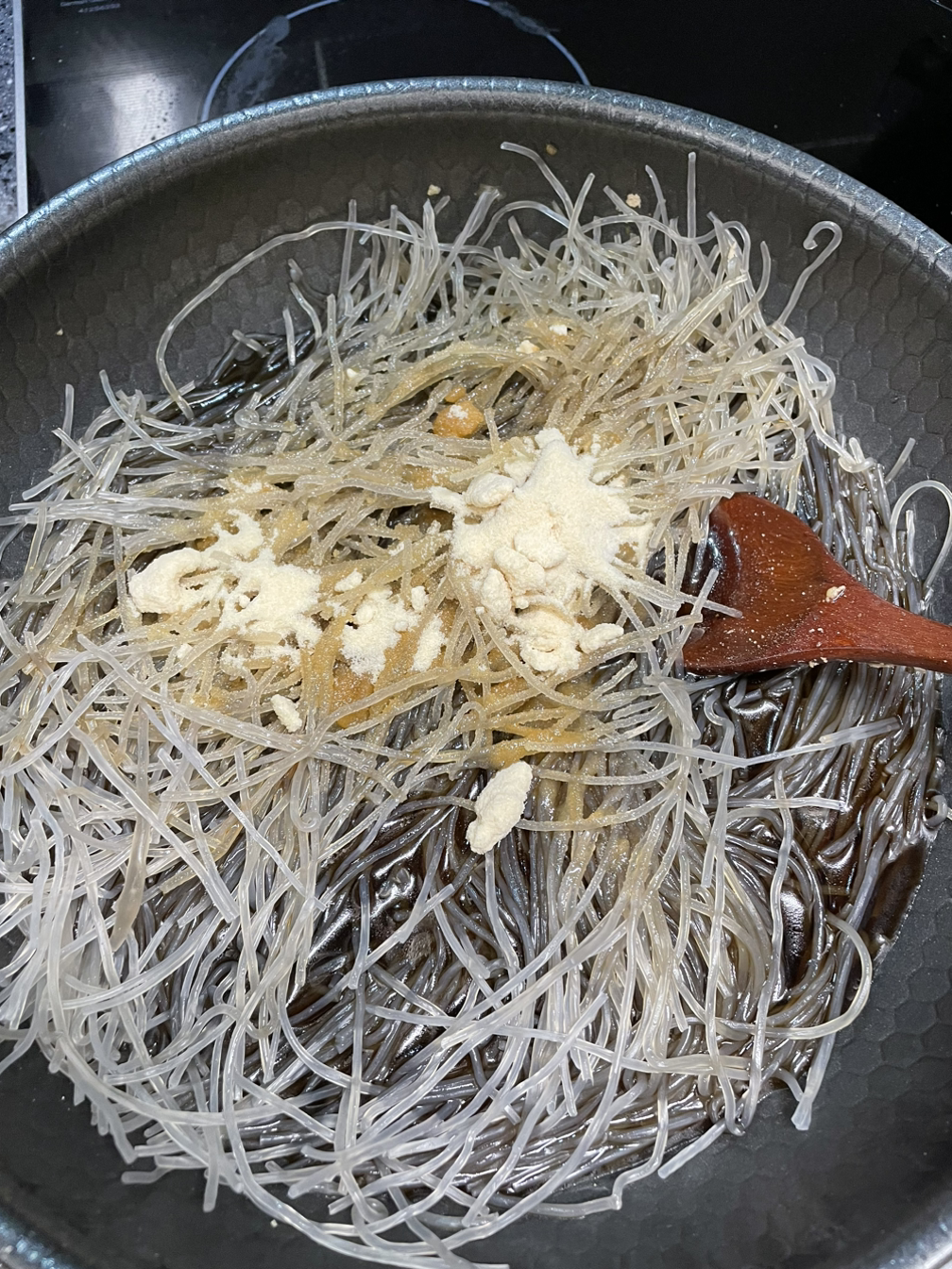 위의 양념을 넣어 양념이 당면에 배어들 때까지 강불에서 저어주며 졸인다.