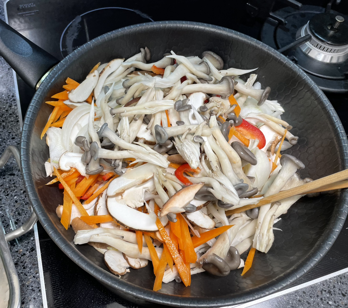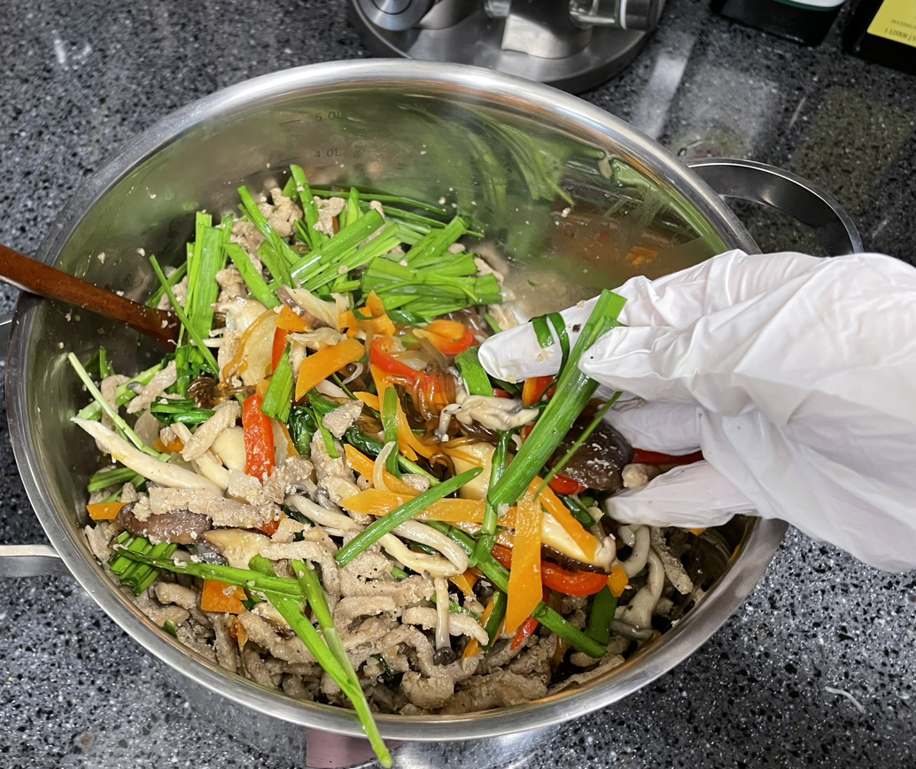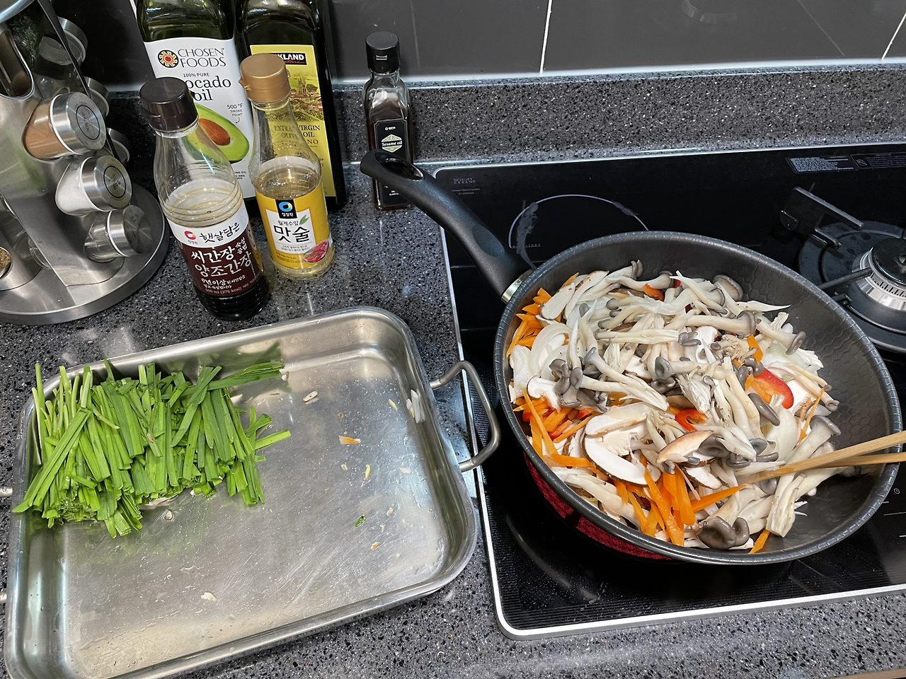 아보카도 오일을 적당히 두르고 열이 오르면 부추를 제외한 나머지 야채를 투하해서 강불로 빠르게 볶는다. 이때 소금과 후추를 조금 쳐서 간을 본다. (너무 많이 넣지는 않도록 한다)