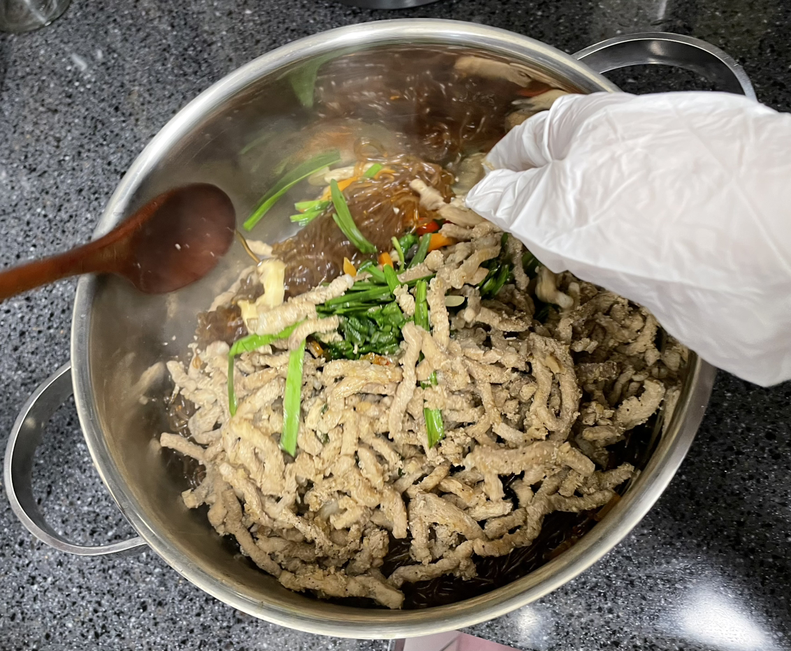 아까 따로 빼 두었던 볶은 야채를 담은 통에 당면을 부어한 데 뒤섞는다. 양이 많기 때문에 장갑으로 뒤섞어 줘야 잘 섞이는데 살짝 뜨겁다 ㅜㅜ 한 김 식힌 뒤 섞어주는 것을 추천.