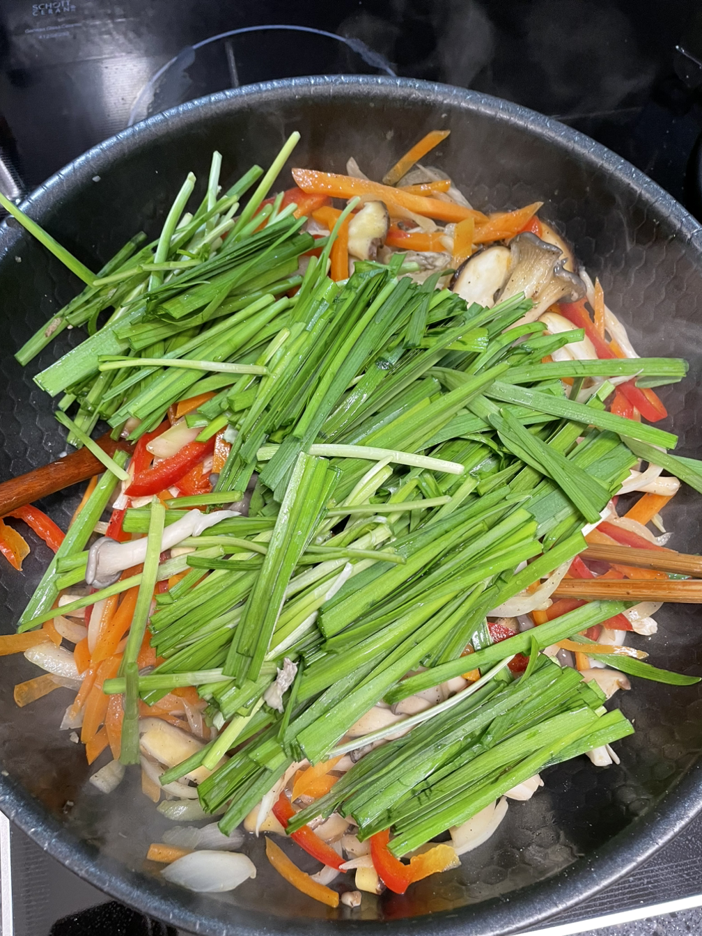 당근과 양파가 투명하게 익으면 마지막에 부추를 넣어 숨이 죽지 않을 만큼 살짝 열감만 가할 정도로 볶아낸다. (이 날의 부추는 살짝 더 숨이 죽어서 모양이 좋진 않았다 ㅠㅠ 타이밍 중요)