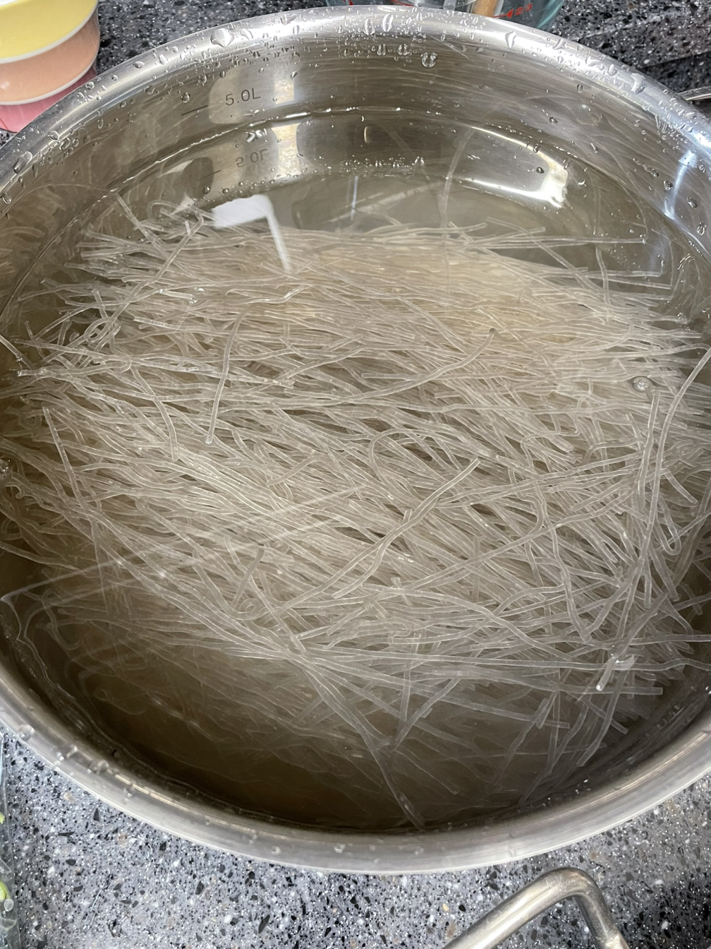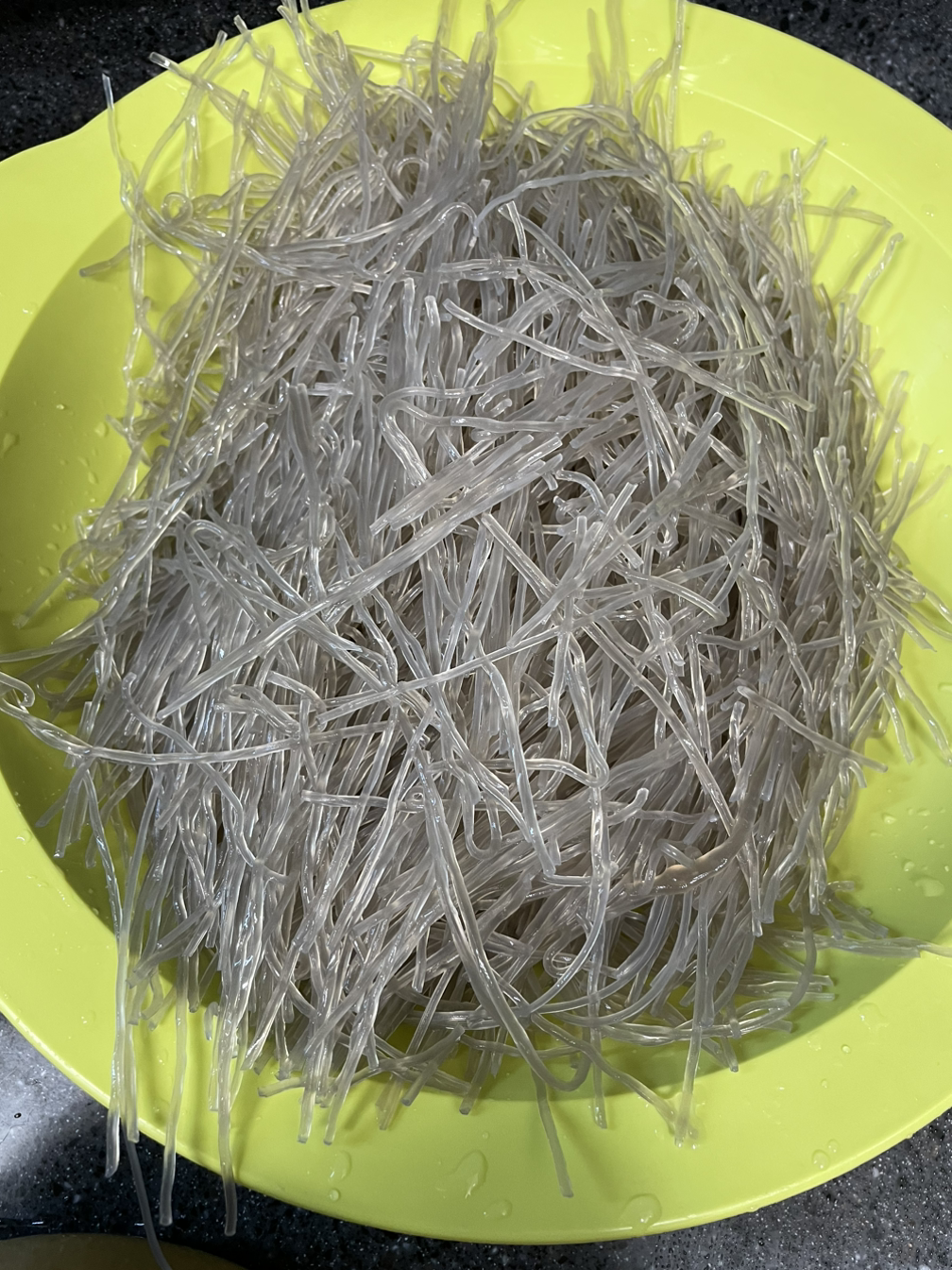 1. 전체 양을 7인분 정도 잡고 당면은 500g 자른 당면 한 봉지를 다 이용했다. 불지 않고 탱글탱글한 식감을 유지하기 위해 찬물에 40분 - 1시간 정도 불려준다.
